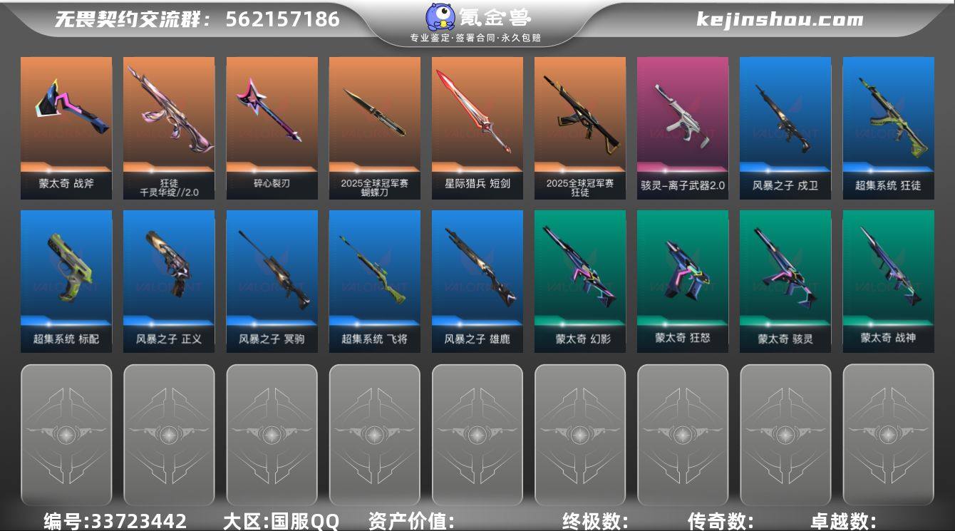 段位: 白银 套装: 2025全球冠军赛 近战武器皮肤: 星际猎兵 短剑,2025全球冠军赛 蝴蝶刀,碎心裂刃,蒙太奇 战斧 步枪皮肤: 2025全球冠军赛 狂徒,狂徒-千灵华绽//2.0,超集系统 狂徒,蒙太奇 幻影,风暴之子 戍卫 佩枪皮肤: 超集系统 标配,风暴之子 正义,蒙太奇 狂怒 狙击枪皮肤: 风暴之子 冥驹,超集系统 飞将 冲锋枪皮肤: 骇灵-离子武器2.0,蒙太奇 骇灵 霰弹枪皮肤: 风暴之子 雄鹿 机枪皮肤: 蒙太奇 战神