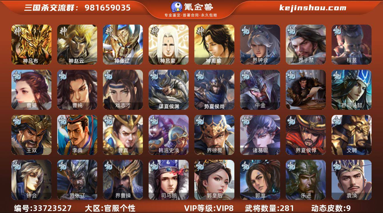 【JYSGS334】官阶:骠骑将军 VIP等级:VIP8级 史诗武将数:19 动态皮肤数:9 武将总数:281 史诗宝珠数:27 元宝数:1822 将魂数:3150 /神吕布/神赵云/神张辽/界于禁/界钟会/程昱/戏志才/曹婴/曹纯/谋赵云/谋关羽/张星彩/周处/界徐盛/界朱然/孙皓/界李儒/麹义/兀突骨/王基/势夏侯尚/谋徐晃/谋张郃/谋夏侯渊/华歆/蔡贞姬/袁涣/王双/崔琰/界曹操/界司马懿/界夏侯惇/界张辽/界许褚/界郭嘉/界甄姬/界徐晃/钟会/曹冲/郭淮/满宠/曹真/韩浩史涣/陈群/曹叡/钟繇/界曹植/界王异/界满宠/界郭淮/郭皇后/诸葛诞/曹昂/SP关羽/SP姜维/文聘/乐进/司马朗/SP蔡文姬/李典/吕虔/杜畿/鲁芝/张恭/阮慧/朱灵/孟达/骥李典/牛金/华雄/袁术/卢植/谋刘赪/谋卢植/羊祜/孔融/界华佗/界袁术/界于吉/界庞德/公孙瓒/伏皇后/李儒/蔡夫人/公孙渊/郭图逢纪/界公孙瓒/曹节/蔡邕/伏完/张宝/SP赵云/刘协/SP黄月英/严白虎/蹋顿/张鲁/董白/董承/樊稠/刘繇/胡车儿/韩遂/乐就/贾充/张任/李傕郭汜/星张辽/何进/神吕蒙/神周瑜/严颜/陈到/势陈到/势陈祗/谋庞统/谋张飞/费祎/王甫赵累/糜夫人/界刘备/界关羽/界赵云/界诸葛亮/界黄月英/界庞统/界姜维/关兴张苞/廖化/关平/刘封/吴懿/周仓/张松/夏侯氏/界法正/界关兴张苞/界马岱/界张嶷...