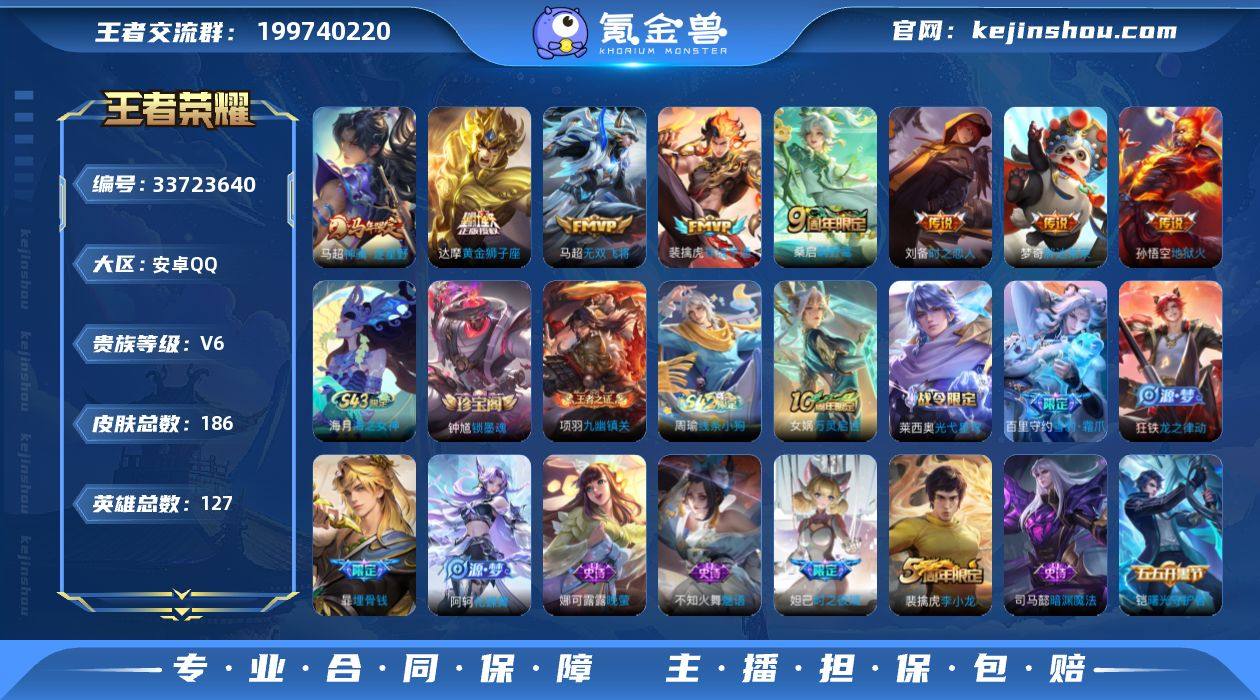 安卓Q-V6-至尊星耀V段位-127英雄-186皮肤-8传说-44史诗 【英雄全皮】:孙权全皮,戈娅全皮 【传说皮肤】:马超神骥逐星野,裴擒虎祥瑞亨通,桑启鸣野蒿,马超无双飞将,刘备时之恋人,达摩黄金狮子座,梦奇胖达荣荣,孙悟空地狱火 【限定皮肤】:暃埋骨钱,虞姬夏日便利店,姜子牙天穹之誓,狄仁杰阴阳师,赵云皇家上将,妲己时之彼端,狄仁杰魔术师,达摩星际陆战队,项羽海滩派对,百里玄策原初追逐者,裴擒虎李小龙,西施玲珑珍味,鲁班大师探海日志,桑启海盐诗旅,戈娅驭风魔法,艾琳女武神,阿古朵江河有灵,张良古海寻踪,高渐离燃音魔法,妲己灵卜魔法,鬼谷子天穹祈灯,沈梦溪龙舞盛年,鲁班七号蔬乡物语,李元芳蔬乡物语,周瑜熔金海岸 【赛季限定】:桑启海盐诗旅,鲁班大师探海日志,张良古海寻踪,鬼谷子天穹祈灯,姜子牙天穹之誓,太乙真人谧流熔炉,钟馗虚灵犬护,甄姬逆浪荇歌,亚瑟荣光之誓,百里玄策原初追逐者,项羽九幽镇关 【战令限定】:达摩星际陆战队,戈娅驭风魔法,西施玲珑珍味,高渐离燃音魔法,妲己灵卜魔法,鲁班七号蔬乡物语,李元芳蔬乡物语,虞姬夏日便利店,莱西奥光弋星穹,明世隐往忆晖光,周瑜线条小狗 【史诗皮肤】:海月海之女神,钟...