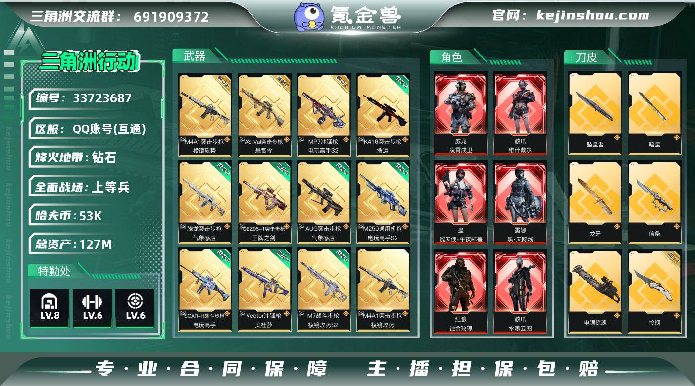 【960105】 极品S蓝砖 m250 你去网吧玩 就是全刀皮 全红皮 !!!! 127m总资产-53k哈夫币-60烽火等级-钻石-39战场等级-上等兵 【干员外观】:红狼-蚀金玫瑰,骇爪-水墨云图,露娜-黑·天际线,蛊-能天使午夜邮差,骇爪-维什戴尔,威龙-凌霄戍卫,威龙-飞虎,蜂医-送葬人·无题密令,深蓝-不破誓约,红狼-电锯惊魂,露娜-金牌射手,乌鲁鲁-荒原猎手,蛊-不羁人生 【近战皮肤】:近战-坠星者,近战-暗星,近战-北极星,近战-信条,近战-黑海,近战-影锋,近战-怜悯,近战-龙牙,近战-电锯惊魂,近战-处刑者4级,近战-黑鹰 【典藏外观】:M4A1突击步枪-棱镜攻势,SCAR-H战斗步枪-电玩高手*3,Vector冲锋枪-美杜莎*3,QBZ95-1突击步枪-王牌之剑,K416突击步枪-命运,AUG突击步枪-气象感应,腾龙突击步枪-气象感应*2,M7战斗步枪-棱镜攻势S2*2,AS Val突击步枪-悬赏令,M250通用机枪-电玩高手S2*3,MP7冲锋枪-电玩高手S2*3 【典藏外观成色】:M4A1突击步枪-棱镜攻势(极品B),SCAR-H战斗步枪-电玩高手(优品B)*3,Vector冲锋枪-美杜莎(优品B)*3,QBZ95-1突击步枪-王牌之剑(优品A),K416突击步枪-命运(优品S),AUG突击步枪-气象感应(优品A),腾龙突击步枪-气象感应(优品S)*2,M7战...