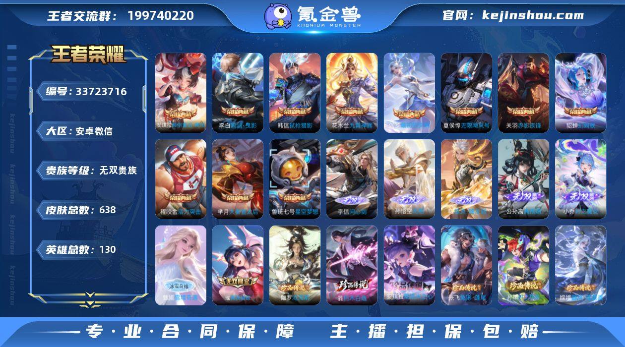 KY21311 安卓微信 638皮无双V10 12典藏7无双6珍品【神骥仙使主页 满级灵宝 1.1W战力小国服姬小满】62按键2天幕 14W流光积分8星元 276限定105传说 对抗路31段 打野26段 金标巅峰对抗路 3054星币 3365英雄碎片 908皮肤碎片 21印记 4荣耀印记 营地号:1894273424【珍品传说】孙策时之奇旅,器灵·落星盏,兔狲·蓬尾,朽木白哉,酷洛米之心,沧流箭‌, 【无 双】真我赫兹瑶,时之魔女,离恨烟,甄姬雪境奇遇,器灵·螭龙剑,无相,问心剑, 【荣耀典藏】九霄神辉,赤影疾锋,鸣剑·曳影,武则天,无限飓风号,活力突击,星空梦想,大秦宣太后,幻阙歌,弑枪猎影,最初的交响,颠倒童话·魔镜, 【星元皮肤】金色仲夏夜,幽冥火,未来机甲,零号雷霆,星际治安官,岁雨灵司,寅虎·焰心,牧野星辉, 【热门限定】愿照·众生和,神骥·镇沧海,神骥·鸣幻洲,神骥·赴朔漠,神骥·越千峰,神骥·逐星野,神骥·聚万邦,千劫归真,星君·娄金,愿照·岁时盈,愿照·千秋盛,愿照·山河定,愿照·九州拓,愿照·福禄聚,器灵·浮梦炉,逐花归海,落雪白狼,凤求凰,至尊宝,乘龙·铭钟鼎,白虎志,青龙志,朱雀志,瑞麟志,玄武志,神威,虎魄,龙胆,烈魂,武圣,李逍遥,冰锋战神,千劫归真,天魔缭乱,白鹤梁神女,超元猎域,如梦令男,异界灵契,零号·赤焰,深海之息,永曜之星,武...