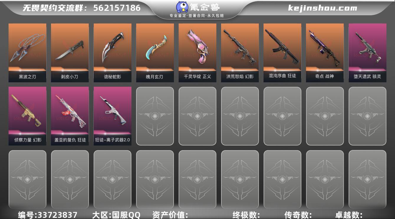 段位: 白银 近战武器皮肤: 魄月玄刃-魄月玄兔,剥皮小刀-异形猎人,黑波之刃-塑水宗,诡秘蛇影 步枪皮肤: 狂徒-盖亚的复仇,幻影-侦察力量,幻影-洪荒怒焰,狂徒-混沌序曲,狂徒-离子武器2.0 佩枪皮肤: 正义-千灵华绽 冲锋枪皮肤: 骇灵-堕天遗武 机枪皮肤: 战神-奇点