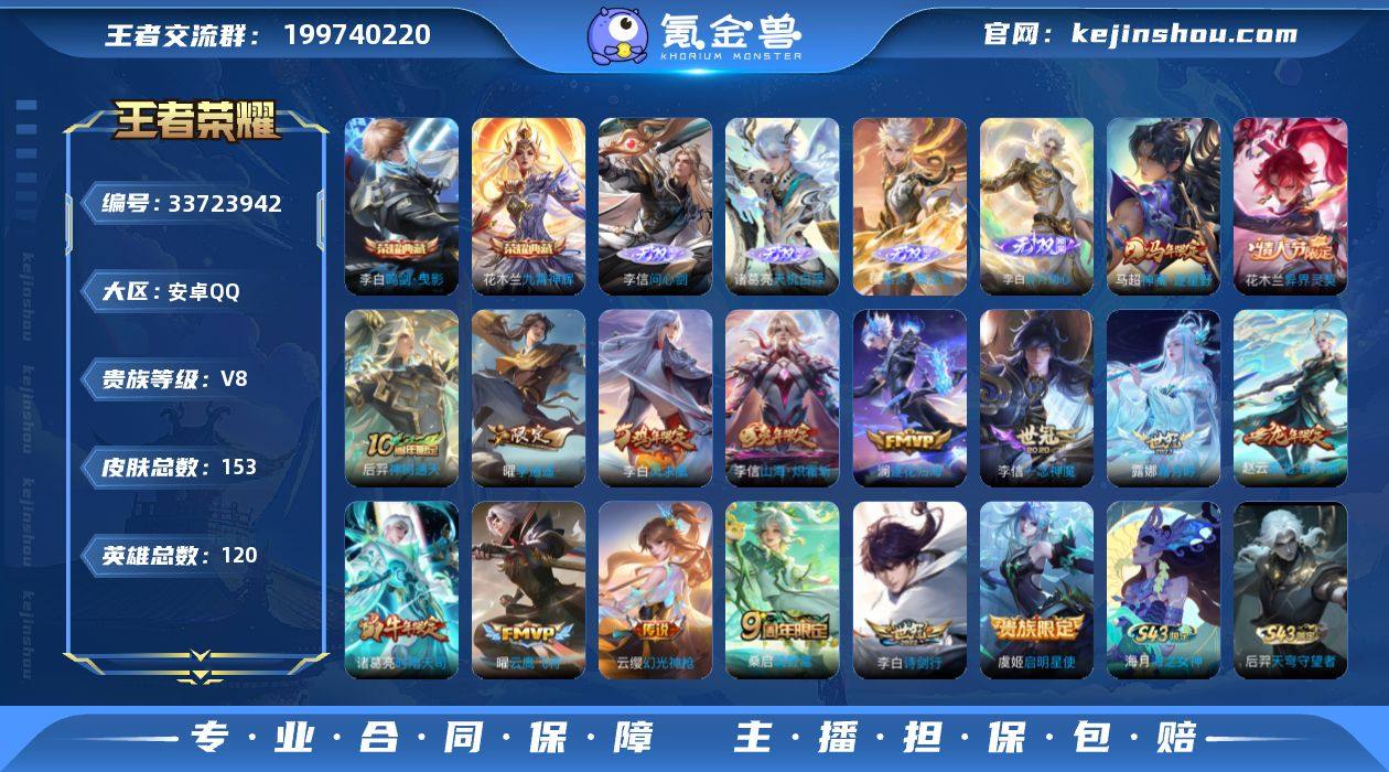 安卓Q-V8-最强王者段位-120英雄-153皮肤-2典藏皮肤-4无双-16传说-55史诗 【英雄全皮】:李白全皮,李信全皮 【荣耀典藏】:李白鸣剑曳影,花木兰九霄神辉 【无双皮肤】:李信问心剑,诸葛亮天机白泽,曜器灵螭龙剑,李白碎月剑心 【传说皮肤】:马超神骥逐星野,花木兰异界灵契,后羿神树通天,云缨幻光神枪,桑启鸣野蒿,赵云乘龙铭钟鼎,澜逐花归海,露娜霜月吟,李信山海炽霜斩,李白诗剑行,曜李逍遥 ,诸葛亮时雨天司,虞姬启明星使,曜云鹰飞将,李信一念神魔,李白凤求凰 【限定皮肤】:暃埋骨钱,蒙犽顽岩魄,姜子牙天穹之誓,李白谪仙醉月,狄仁杰阴阳师,赵云皇家上将,赵云百木心枪,吕布御风骁将,元歌无心,狄仁杰魔术师,项羽海滩派对,韩信傲雪梅枪,孙悟空孙行者,后羿如梦令,虞姬启明星使,诸葛亮时雨天司,百里玄策原初追逐者,裴擒虎李小龙,李信山海炽霜斩,曜李逍遥 ,高渐离燃音魔法,妲己灵卜魔法,鬼谷子天穹祈灯,李白碎月剑心,赵云乘龙铭钟鼎,沈梦溪龙舞盛年,刘邦剑破天穹,镜青焰无极,项羽苍威无极,周瑜熔金海岸 【年限皮肤】:李白凤求凰,诸葛亮时雨天司,吕布御风骁将,李信山海炽霜斩,赵云乘龙铭钟鼎 【赛季限定】:鬼谷子天穹祈灯,刘...