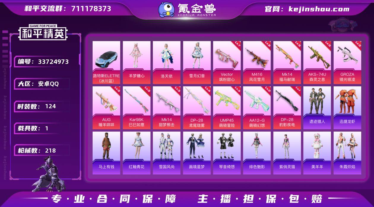 【kyhp2146】安卓 手Q-3粉装-12特效枪-1载具-1粉色飞行器-59285热力值-1王牌印记-124套装-218枪皮 【热门品类】:套装-金羽特工,套装-龟仙人,套装-粉红小猪 【粉色套装】:角色-洛天依,粉装-雪月幻音,角色-羊梦糖心 【粉色枪皮等级】:M416-风花雪月(六级),GROZA-镜光银凌(五级),AUG-暖羊咩咩(五级),UMP45-萌骑冒险(三级),Vector-飒粉甜心(七级),AKS-74U-森灵之息(五级),Kar98K-巳巳如意(五级),Mk14-甜梦熊击(五级),Mk14-福马献瑞(五级),AA12-G-萌骑幻想(二级),DP-28-豹影疾电(一级),DP-28-鸢尾珑雾(四级) 【粉色载具】:路特斯ELETRE(冰川蓝) 【粉色枪皮】:M416-风花雪月,GROZA-镜光银凌,AUG-暖羊咩咩,UMP45-萌骑冒险,Vector-飒粉甜心,AKS-74U-森灵之息,Kar98K-巳巳如意,Mk14-甜梦熊击,Mk14-福马献瑞,AA12-G-萌骑幻想,DP-28-豹影疾电,DP-28-鸢尾珑雾 【粉色飞行器】:梦幻火箭飞行器 【粉色降落伞】:绝对恒星降落伞,梦幻火箭降落伞,洛神天依降落伞,闲梦青缨降落伞,精灵梦叶罗丽降落伞,星穹咏叹调降落伞,异瞳寒姬降落伞,炫彩糖果降落伞,霁蓝缠春降落伞 【稀有套装】:套装-龟仙人,套装-巳巳如意,套装-小鸟芋圆,套装-雪国风尚,套装-...