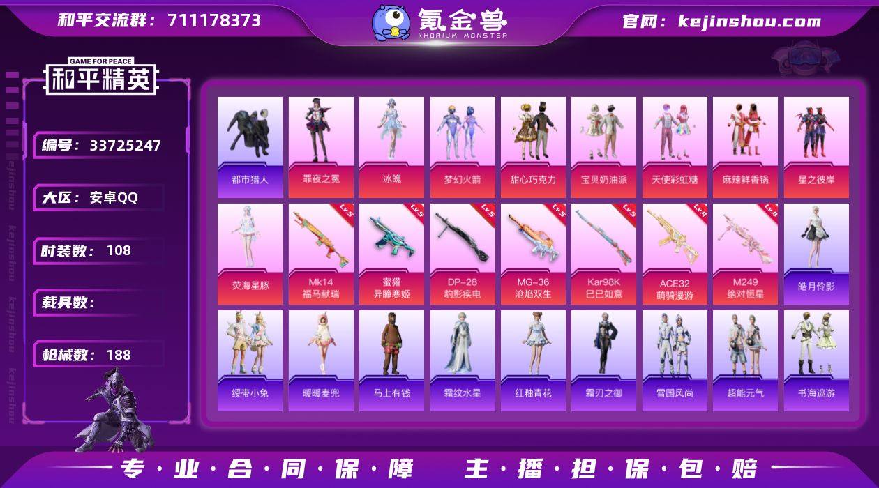 YZJ16968 无二次 安卓Q-2稀有9粉装7特效枪6热门 身法小女号 地铁满天赋 三字ID(屁屁甘) 新101 巧克力三姐妹 星豚 纯白跃动 麦兜 都市 天命 红眼罩 108套装188枪皮 47764热力值 2印记 历史卓越王牌12星 【2稀有】 都市猎人 浪漫天命 【9粉装】 冰魄 梦幻火箭 宝贝奶油派 天使彩虹糖 甜心巧克力 荧海星豚 罪夜之冕 麻辣鲜香锅 星之彼岸 【7特效枪】 Kar98K-巳巳如意 (5级) MG-36-沧焰双生 (5级) DP-28-豹影疾电 (5级) 蜜獾-异瞳寒姬 (5级) M249-绝对恒星 (4级) Mk14-福马献瑞 (5级) ACE32-萌骑漫游 (4级) 【6热门】 呆萌铁蟹 鹰眼刺客 激萌罗小黑 暗影哥特 漫步者 破蛋小黄鸡 【2头盔】 梦幻火箭头盔 甜心宝贝头盔 【2背包】 梦幻火箭背包 甜心宝贝背包 营地ID:972545926