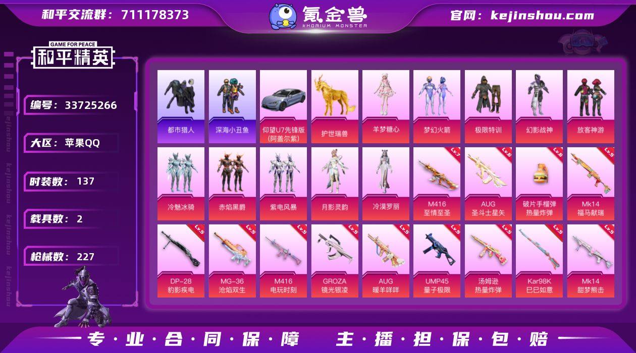 【kyhp2153】苹果 手Q-10粉装-19特效枪-2载具-8粉色飞行器-70773热力值-7王牌印记-137套装-227枪皮 【热门品类】:粉装-梦幻火箭,套装-浪漫天命,套装-都市猎人,套装-深海小丑鱼,套装-小丑鱼,套装-忍者信条,套装-暗夜之虎,套装-龟仙人,套装-暗影哥特,角色-8号机,熔岩游骑兵连帽夹克 【粉色套装】:粉装-极限特训,粉装-幻影战神,粉装-梦幻火箭,粉装-放客神游,粉装-冷魅冰骑,粉装-赤焰黑爵,粉装-紫电风暴,角色-月影灵韵,角色-冷漠罗丽,角色-羊梦糖心 【粉色枪皮等级】:M416-至情至圣(七级),M416-电玩时刻(五级),GROZA-镜光银凌(五级),AUG-暖羊咩咩(五级),AUG-圣斗士星矢(六级),ACE32-萌骑漫游(三级),UMP45-量子极限(五级),Vector-绯穹魔姬(四级),汤姆逊-热量炸弹(五级),AKS-74U-森灵之息(四级),P90-沙丘之主(三级),Kar98K-巳巳如意(五级),Mk14-甜梦熊击(五级),Mk14-福马献瑞(五级),MK12-雪月幻音(四级),DP-28-豹影疾电(五级),MG-36-沧焰双生(五级),燃烧瓶-天降桃花(五级),破片手榴弹-热量炸弹(六级) 【粉色载具】:仰望U7(阿盖尔紫),护世瑞兽 【粉色枪皮】:M416-至情至圣,M416-电玩时刻,GROZA-镜光银凌,AUG-暖羊咩咩,AUG-圣斗士星...