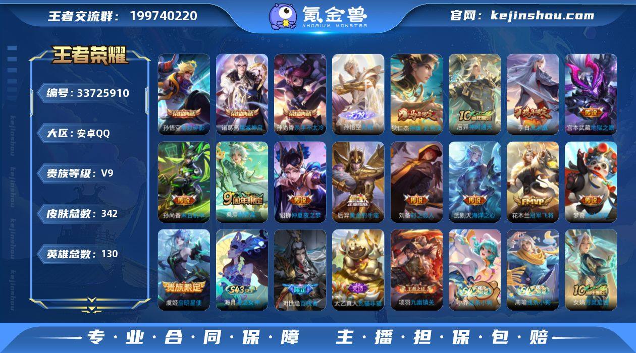 安卓Q-V9-最强王者段位-130英雄-342皮肤-3典藏皮肤-1典藏英雄-1无双-13传说-98史诗 【英雄全皮】:孙权全皮,敖隐全皮,影全皮 【荣耀典藏】:武则天英雄,孙悟空全息碎影,孙尚香杀手不太冷,诸葛亮星域神启 【无双皮肤】:孙悟空无相 【传说皮肤】:狄仁杰神骥赴朔漠,后羿神树通天,桑启鸣野蒿,虞姬启明星使,刘备时之恋人,花木兰冠军飞将,梦奇胖达荣荣,后羿黄金射手座,貂蝉仲夏夜之梦,李白凤求凰,孙尚香末日机甲,宫本武藏地狱之眼,武则天海洋之心 【限定皮肤】:白起狰,蒙犽顽岩魄,姜子牙天穹之誓,狄仁杰阴阳师,小乔纯白花嫁,虞姬凯尔特女王,赵云皇家上将,赵云龙胆,嬴政白昼王子,庄周蜃楼王,高渐离死亡摇滚,高渐离玩趣恶龙,阿轲迷踪丽影,孙膑妖精王,扁鹊炼金王,芈月重明,吕布猎兽之王,周瑜真爱至上,元歌云间偶戏,夏侯惇朔风刀,甄姬游园惊梦,典韦穷奇,马可波罗逐梦之星,狄仁杰魔术师,狄仁杰万华元夜,达摩星际陆战队,项羽海滩派对,老夫子醍醐杖,关羽冰锋战神,程咬金演武夺筹,刘邦夺宝奇兵,韩信逐梦之影,王昭君凤凰于飞,花木兰青春决赛季,亚瑟狮心王,亚瑟潮玩骑士王,孙悟空美猴王,孙悟空至尊宝,牛魔御旌,李元芳云中旅人,虞...