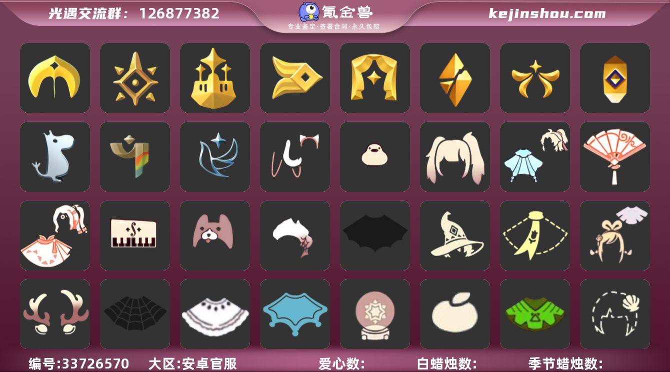 账号类型: 邮箱账号 季节已毕业: 圣岛季,预言季,梦想季,风行季,表演季,破晓季,欧若拉季,追忆季,姆明季,彩染季,青鸟季 完成地图: 晨岛,云野,雨林,霞谷,暮土,禁阁,全图毕业 礼包: 蝙蝠套,巫师,围巾,绊爱,鹿角,蜘蛛斗,白绒金,瑞雪,雪花球,橘子,粽叶,贝壳,兔子,南瓜,雪花,鲤鱼,彩虹耳钉,四叶草,小提琴,爱心眼镜,创始人,蛛网朋克,衔福献瑞礼包,献瑞折扇礼包,渐变双马尾发型礼包,小狗周年发饰,立式钢琴礼包,青衫落拓礼包,小黄鸭发饰礼包,皮皮猫套装礼包 裤子: 武士裤