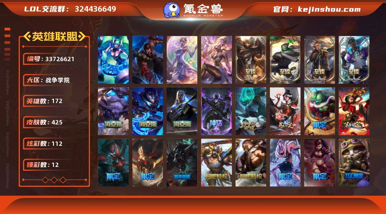 t40068 皇冠账号【战争学院】425皮肤 112炫彩 12臻彩 14神话/64限定/43传说/172英雄 账号等级:527 单双排段位:黄金 【重要头像】云顶战斗学院伊泽瑞尔 爱意绵绵 万圣节卡特琳娜 水晶圣骑艾希头 【重要皮肤】安魂曲娑娜至臻 机神玄武盖伦至臻 星之守护者艾克至臻 灵能特工伊泽瑞尔至臻 征服者贾克斯至臻 灰烬骑士莫德凯撒 海克斯科技斯维因 海克斯科技吉格斯 海克斯科技嘉文四世 水晶圣骑艾希 胜利剑圣易 胜利女神娑娜 胜利巨口克格莫 创星之灵璐璐 电玩勇者锐雯 玉剑传说舞龙卫 点心宝贝阿木木 银龙裁决泰隆 天龙之子斯莫德 神龙烈焰金克丝 古琴余韵娑娜 踏雪寻梅卡蜜尔 觅心猫猫悠米 双城之战2微光实验室辛吉德 北极星发明家塞拉斯 雪球也能爆炸吉格斯 冬季仙境卡尔玛 魄罗骑士瑟庄妮 魅惑女巫厄运小姐 魅惑女巫奈德丽 泳池派对普朗克 泳池派对辛德拉 泳池派对菲奥娜 泳池派对格雷福斯 电玩战魂赫卡里姆 DWG奈德丽 FPX薇恩 SKTT1扎克 SKTT1瑞兹 SSW图奇 暗杀星奥莉安娜 暗杀星蒙多 暗杀星慎 Fnatic迦娜 Fnatic库奇 Fnatic古拉加斯 防暴士兵格雷福斯 防暴士兵辛吉德 防暴天使凯尔 钢铁之翼艾尼维亚 冠军之矛卡莉丝塔...