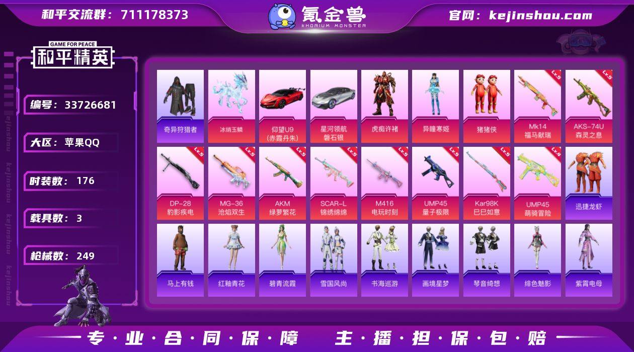 苹果 手Q-3粉装-10特效枪-3载具-6粉色飞行器-73684热力值-20王牌印记-176套装-249枪皮 【热门品类】:绝对防御上衣,套装-浪漫天命,套装-小丑鱼,套装-奇异狩猎者,套装-龟仙人,套装-暗影哥特,角色-Mark.06 【粉色套装】:玩偶服-猪猪侠,角色-异瞳寒姬,角色-虎痴许褚 【粉色枪皮等级】:AKM-绿萝繁花(五级),SCAR-L-锦绣绵绵(五级),M416-电玩时刻(五级),UMP45-量子极限(五级),UMP45-萌骑冒险(四级),AKS-74U-森灵之息(五级),Kar98K-巳巳如意(五级),Mk14-福马献瑞(五级),DP-28-豹影疾电(五级),MG-36-沧焰双生(五级) 【粉色载具】:仰望U9(赤霞丹朱),星河领航(磐石银),冰绡玉鳞 【粉色枪皮】:AKM-绿萝繁花,SCAR-L-锦绣绵绵,M416-电玩时刻,UMP45-量子极限,UMP45-萌骑冒险,AKS-74U-森灵之息,Kar98K-巳巳如意,Mk14-福马献瑞,DP-28-豹影疾电,MG-36-沧焰双生 【粉色飞行器】:酣梦熊熊飞行器,炫彩糖果飞行器,繁龙极客飞行器,飞天猪飞行器,灵珠游龙飞行器,极意拳锋飞行器 【粉色降落伞】:幻影战神降落伞,星之彼岸降落伞,仲夏莫吉托降落伞,闲梦青缨降落伞,时空协奏降落伞,临安公主降落伞,喜羊羊与灰太狼降落伞,魔童闹海 哪吒降落伞,魔童闹海...
