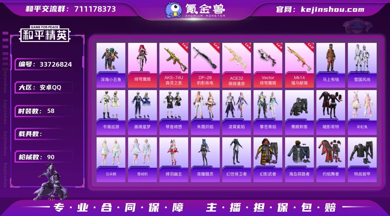 【kyhp2169】安卓 手Q-1粉装-5特效枪-0载具-1粉色飞行器-21410热力值-2王牌印记-58套装-90枪皮 【热门品类】:套装-深海小丑鱼,套装-暗影哥特 【粉色套装】:角色-绯穹魔姬 【粉色枪皮等级】:ACE32-萌骑漫游(四级),Vector-绯穹魔姬(四级),AKS-74U-森灵之息(五级),Mk14-福马献瑞(二级),DP-28-豹影疾电(五级) 【粉色枪皮】:ACE32-萌骑漫游,Vector-绯穹魔姬,AKS-74U-森灵之息,Mk14-福马献瑞,DP-28-豹影疾电 【粉色飞行器】:炫彩糖果飞行器 【粉色降落伞】:精灵梦叶罗丽降落伞,绯穹魔姬降落伞,异瞳寒姬降落伞,炫彩糖果降落伞 【稀有套装】:套装-雪国风尚,套装-炫彩糖果,套装-马上有钱,套装-彩虹兔,套装-云朵鹅,套装-雪绒豹,角色-绛羽幽主,角色-夜瞳黯灵,套装-朱霞炽焰,套装-凌霄紫焰,套装-擎苍青焰,套装-书海巡游,套装-画境星梦,套装-琴音绮想 【稀有枪皮】:AKM-影袭,SCAR-L-夜灯,M416-红色方程式,GROZA-影袭,AUG-耀粉歌者,M762-云朵鹅,蜜獾-绯穹魔姬,ACE32-画境星梦,ARX-凌霄紫焰,UZI-啾咪啾咪,UZI-影袭,UMP45-夜灯,UMP45-极意拳锋,汤姆逊-耀粉歌者,MP5K-画境星梦,JS9-凌霄紫焰,Kar98K-红色方程式,M24-影袭,VSS-彩虹符号,Mini...