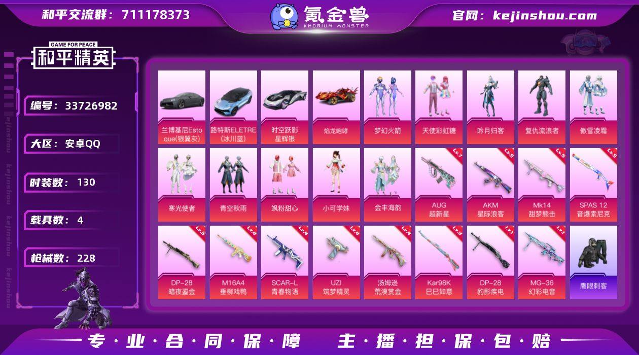 【kyhp2173】安卓 手Q-10粉装-12特效枪-4载具-0粉色飞行器-71171热力值-7王牌印记-130套装-228枪皮 【热门品类】:粉装-梦幻火箭,套装-龟仙人,角色-Mark.06 【粉色套装】:粉装-天使彩虹糖,粉装-梦幻火箭,粉装-吟月归客,角色-复仇流浪者,粉装-傲雪凌霜,粉装-寒光使者,粉装-青空秋雨,粉装-飒粉甜心,角色-小可学妹,粉装-金丰海韵 【粉色枪皮等级】:AKM-星际浪客(五级),M16A4-垂柳戏鸭(四级),SCAR-L-青春物语(四级),AUG-超新星(七级),UZI-筑梦精灵(四级),汤姆逊-荒漠赏金(四级),Kar98K-巳巳如意(三级),Mk14-甜梦熊击(五级),SPAS-12-音爆索尼克(五级),DP-28-暗夜鎏金(五级),DP-28-豹影疾电(一级),MG-36-幻彩电音(一级) 【粉色载具】:兰博基尼Estoque(银翼灰),路特斯ELETRE(冰川蓝),时空跃影(星辉银),焰龙咆哮,僚机-萌兔起飞 【粉色枪皮】:AKM-星际浪客,M16A4-垂柳戏鸭,SCAR-L-青春物语,AUG-超新星,UZI-筑梦精灵,汤姆逊-荒漠赏金,Kar98K-巳巳如意,Mk14-甜梦熊击,SPAS-12-音爆索尼克,DP-28-暗夜鎏金,DP-28-豹影疾电,MG-36-幻彩电音 【粉色降落伞】:未来战士降落伞,梦幻火箭降落伞,暗夜玫瑰降落伞,林间仙鹿降落伞,闪光银龙降落伞...