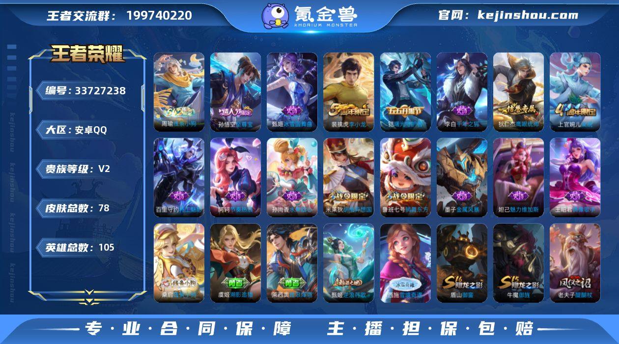 安卓Q-V2-尊贵铂金III段位-105英雄-78皮肤-15史诗 【限定皮肤】:狄仁杰阴阳师,鲁班七号狮舞东方,夏侯惇朔风刀,狄仁杰万华元夜,达摩星际陆战队,达摩沙漠行僧,项羽海滩派对,老夫子醍醐杖,程咬金演武夺筹,孙悟空至尊宝,牛魔御旌,钟馗神迹守卫,钟馗驱傩正仪,鬼谷子原初探秘者,弈星混沌棋,明世隐疑决卦,裴擒虎李小龙,米莱狄胡桃异想国,盾山御銮,上官婉儿梁祝 【赛季限定】:牛魔御旌,盾山御銮,夏侯惇朔风刀,弈星混沌棋,明世隐疑决卦,老夫子醍醐杖,鬼谷子原初探秘者,狄仁杰万华元夜,程咬金演武夺筹,钟馗驱傩正仪,达摩沙漠行僧,太乙真人谧流熔炉,甄姬逆浪荇歌 【战令限定】:鲁班七号狮舞东方,钟馗神迹守卫,米莱狄胡桃异想国,达摩星际陆战队,周瑜线条小狗 【史诗皮肤】:周瑜线条小狗,米莱狄胡桃异想国,裴擒虎李小龙,上官婉儿梁祝,狄仁杰鹰眼统帅,鲁班七号狮舞东方,阿轲节奏热浪,铠曙光守护者,百里守约特工魅影,孙悟空至尊宝,李白千年之狐,墨子金属风暴,妲己魅力维加斯,孙尚香水果甜心,王昭君偶像歌手,甄姬冰雪圆舞曲 【其他皮肤】:桑启线条小狗,虞姬溯影追猎,莱西奥踏浪烽翎,甄姬逆浪荇歌,西施雪境奇遇,太乙真人谧流熔炉...