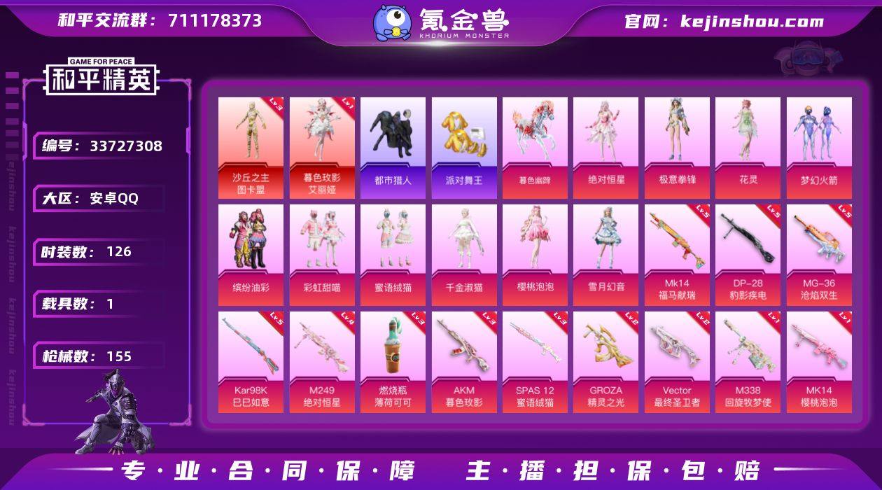 【kyhp2175】安卓 手Q-2神装-10粉装-12特效枪-1载具-9粉色飞行器-56900热力值-5王牌印记-126套装-155枪皮 【红色神装等级】:暮色玫影-艾丽娅(一级),沙丘之主-图卡盟(三级) 【红色角色神装】:暮色玫影-艾丽娅,沙丘之主-图卡盟 【热门品类】:粉装-梦幻火箭,粉装-缤纷油彩,套装-浪漫天命,套装-都市猎人,套装-派对舞王,套装-暗影哥特,套装-粉红小猪,套装-红熊茄茄 【粉色套装】:角色-绝对恒星,粉装-梦幻火箭,粉装-缤纷油彩,粉装-彩虹甜喵,粉装-蜜语绒猫,角色-千金淑猫,角色-樱桃泡泡,粉装-雪月幻音,角色-花灵,粉装-极意拳锋 【粉色枪皮等级】:AKM-暮色玫影(三级),GROZA-精灵之光(二级),Vector-最终圣卫者(二级),Kar98K-巳巳如意(五级),Mk14-樱桃泡泡(一级),Mk14-福马献瑞(五级),SPAS-12-蜜语绒猫(三级),M249-绝对恒星(四级),DP-28-豹影疾电(五级),MG-36-沧焰双生(五级),M338-回旋牧梦使(一级),燃烧瓶-薄荷可可(三级) 【粉色载具】:僚机-萌兔起飞,暮色幽蹄 【粉色枪皮】:AKM-暮色玫影,GROZA-精灵之光,Vector-最终圣卫者,Kar98K-巳巳如意,Mk14-樱桃泡泡,Mk14-福马献瑞,SPAS-12-蜜语绒猫,M249-绝对恒星,DP-28-豹影疾电,MG-36-沧焰双生...