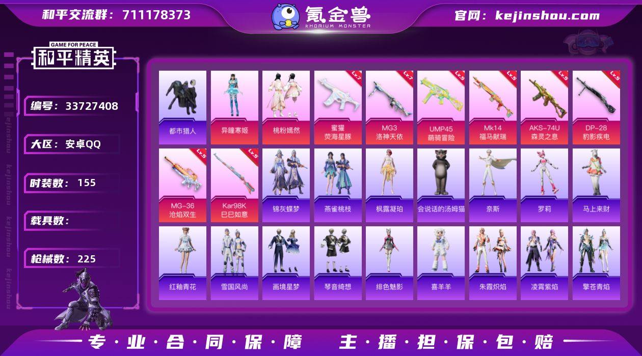 安卓 手Q-2粉装-8特效枪-0载具-3粉色飞行器-61740热力值-13王牌印记-155套装-225枪皮 【热门品类】:套装-浪漫天命,套装-都市猎人,套装-龟仙人,套装-暗影哥特 【粉色套装】:粉装-桃粉嫣然,角色-异瞳寒姬 【粉色枪皮等级】:蜜獾-荧海星豚(七级),UMP45-萌骑冒险(五级),AKS-74U-森灵之息(五级),Kar98K-巳巳如意(五级),Mk14-福马献瑞(五级),DP-28-豹影疾电(五级),MG3-洛神天依(七级),MG-36-沧焰双生(五级) 【粉色枪皮】:蜜獾-荧海星豚,UMP45-萌骑冒险,AKS-74U-森灵之息,Kar98K-巳巳如意,Mk14-福马献瑞,DP-28-豹影疾电,MG3-洛神天依,MG-36-沧焰双生 【粉色飞行器】:炫彩糖果飞行器,天之羽翼飞行器,冰狼掠影飞行器 【粉色降落伞】:炫紫旋律降落伞,怪笑疯兔降落伞,镜光幻境降落伞,夜幕颂歌降落伞,未来领航者降落伞,桃粉嫣然降落伞,宁雨蝶降落伞,异瞳寒姬降落伞,炫彩糖果降落伞,镜花水月降落伞,鸢尾珑雾降落伞 【稀有套装】:套装-龟仙人,套装-巳巳如意,套装-雪国风尚,套装-炫彩糖果,角色-奈斯,角色-罗莉,套装-马上来财,角色-光矢逐梦,套装-燕燕于飞,套装-鱼渊荷华,套装-新风雅兰,套装-粉恋花,套装-紫幽梦,套装-蓝冰羽,套装-云朵鹅...