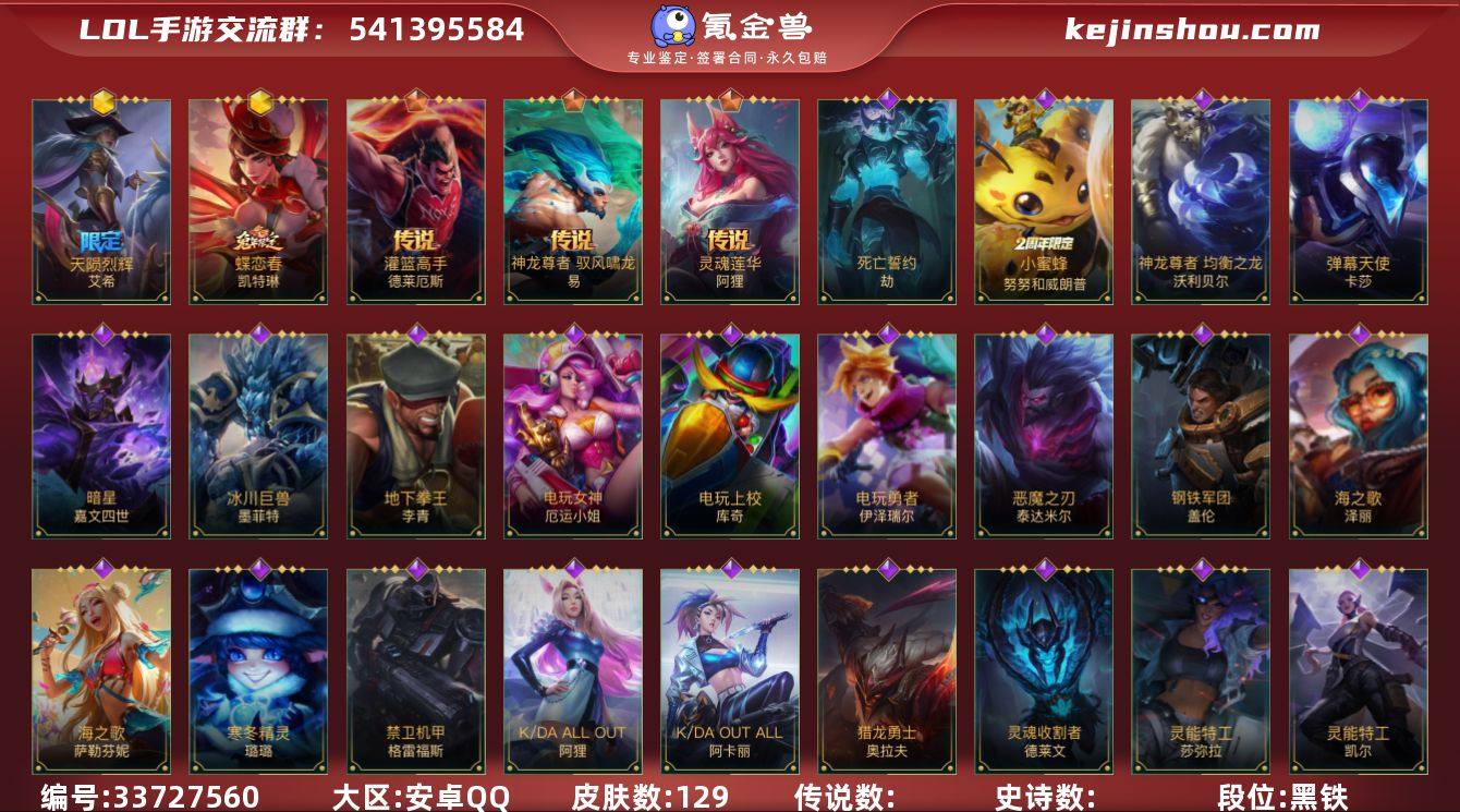 137英雄-129皮肤 【神话皮肤】:夜星流火 金克丝,暮星追影 卡莎,流光仙韵 莫甘娜,天陨烈辉 艾希,蝶恋春 凯特琳 【传说皮肤】:灵魂莲华 阿狸,神龙尊者 驭风啸龙 易,灌篮高手 德莱厄斯 【史诗皮肤】:钢铁军团 盖伦,太空律动 “舞林双子” 努努和威朗普,小蜜蜂 努努和威朗普,恶魔之刃 泰达米尔,清剿小队 金克丝,蕊雪盈春:晏安 赫卡里姆,猛虎 布隆,圣诞老人 布隆,礼物选好了吗? 布隆,圣龙 奥瑞利安·索尔,弹幕天使 卡莎,神龙尊者 玉境灵龙 卡莎,清剿小队 潘森,K/DA ALL OUT 阿卡丽,玉剑传说 无双 菲奥娜,海之歌 萨勒芬妮,银河魔装机神 安妮,K/DA ALL OUT 阿狸,源计划:阴 劫,死亡誓约 劫,灵能特工 凯尔,我,羽饰骑士 崔丝塔娜,寒冬精灵 璐璐,暗星 嘉文四世,神龙尊者 均衡之龙 沃利贝尔,地下拳王 李青,电玩上校 库奇,太空律动 “狗头” 内瑟斯,星之守护者 厄运小姐,电玩女神 厄运小姐,海之歌 泽丽,心之钢 永恩,禁卫机甲 格雷福斯,战斗教授 格雷福斯,灵魂收割者 德莱文,神龙尊者 苍龙 艾希,冰川巨兽 墨菲特,暗星 墨菲特,黑夜使者 弗拉基米尔,白色死神 韦鲁斯,电玩勇者 伊泽瑞尔,灵能特工 莎弥拉,猎龙勇士 奥拉夫,泳池派对 凯特琳,...