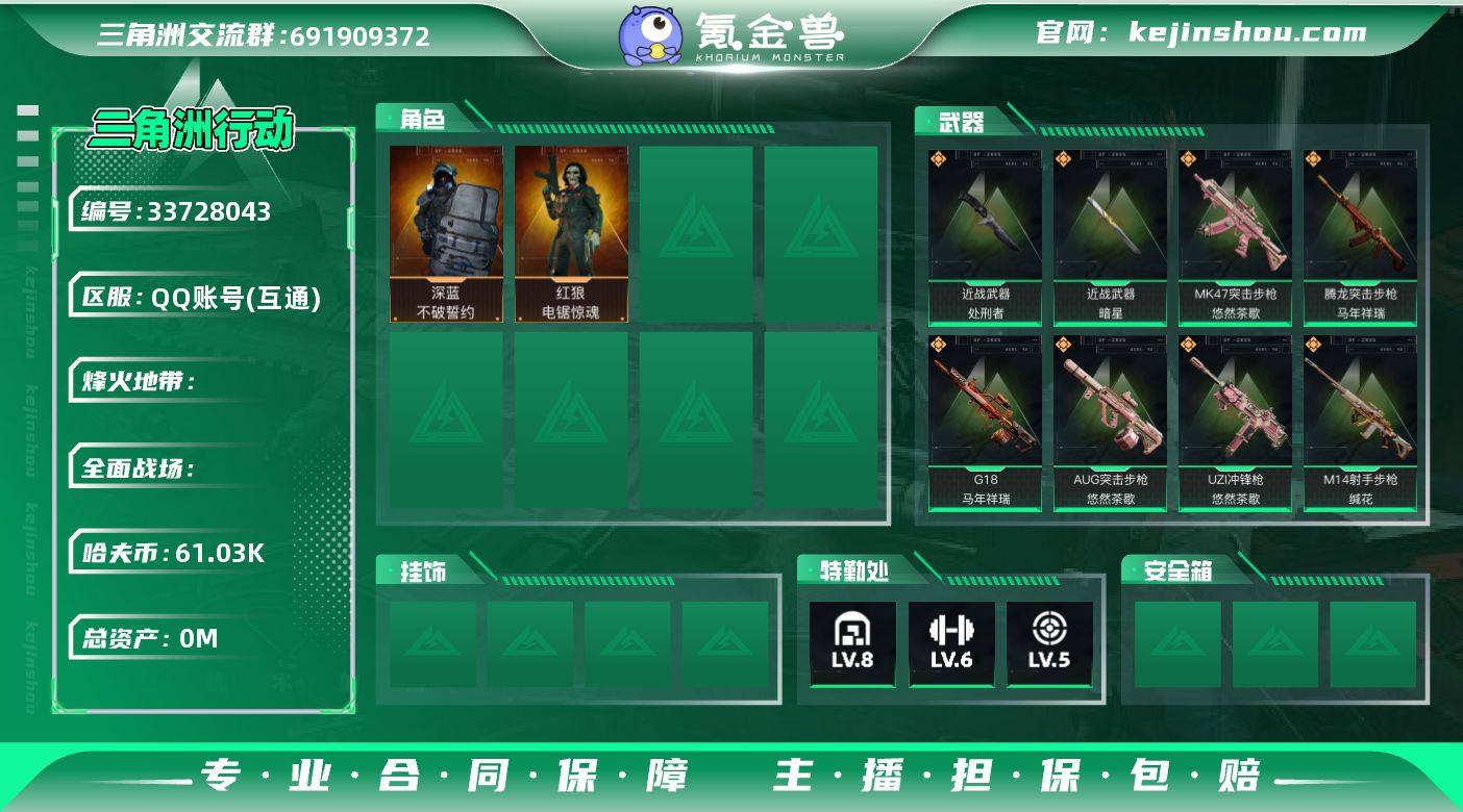 337m总资产-61036k哈夫币-60烽火等级-黑鹰-48战场等级-上等兵 【干员外观】:深蓝-不破誓约,红狼-电锯惊魂 【近战皮肤】:近战-暗星,近战-处刑者3级,近战-黑鹰 【传说外观】:M4A1突击步枪-蚀金玫瑰,M4A1突击步枪-阿米娅,ASh-12战斗步枪-鹅鸭杀,K416突击步枪-行动记录,AUG突击步枪-悠然茶歇,AK-12突击步枪-特斯拉线圈,SCAR-H战斗步枪-启航,CAR-15突击步枪-阿米娅,腾龙突击步枪-捞点薯条,腾龙突击步枪-马年祥瑞,腾龙突击步枪-万金泪冠,KC17突击步枪-电锯惊魂,MK47突击步枪-悠然茶歇,UZI冲锋枪-特斯拉线圈,UZI冲锋枪-悠然茶歇,SMG-45冲锋枪-骑士,SR-3M紧凑突击步枪-特斯拉线圈,勇士冲锋枪-能天使-午夜邮差,勇士冲锋枪-万金泪冠,QCQ171冲锋枪-鹅鸭杀,M250通用机枪-骑士之心,QJB201轻机枪-鹅鸭杀,M14射手步枪-缄花,SR-25射手步枪-水墨云图,SR-25射手步枪-缄花,AWM狙击步枪-捞点薯条,AWM狙击步枪-万金泪冠,.357左轮-缄花,G18-马年祥瑞,93R-捞点薯条,复合弓-黑·天际线 【史诗外观】:AKM突击步枪-林中猎手,QBZ95-1突击步枪-曙光,ASh-12战斗步枪-无极限,K416突击步枪-竞技风,K416突击步枪-冬日风情,K416突击步枪-阿萨拉特攻,M16A4突击步枪-竞...