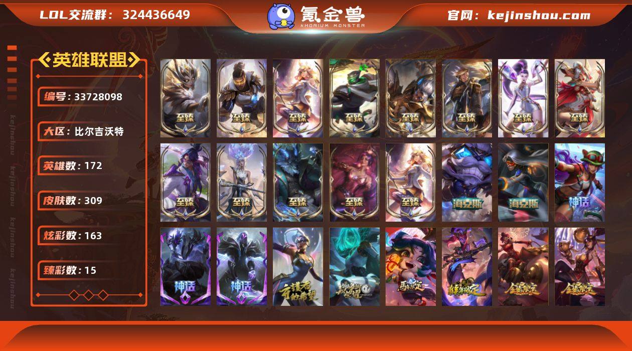 t40202 皇冠账号【比尔吉沃特】 原皮龙瞎 309皮肤 163炫彩 15臻彩 22神话/39限定/45传说/172英雄 账号等级:338 单双排段位:铂金 【重要头像】星守阿狸 云顶战斗学院伊泽瑞尔 至爱的鹿 银河魔装机神安妮 KDA萨勒芬妮 此志无双羽饰骑士 至臻剪纸仙灵希维尔 至臻海珀利安小队迦娜 至臻魔女婕拉 【重要皮肤】剪纸仙灵希维尔至臻 北极星使者沃里克至臻 灵魂莲华易至臻 海珀利安小队X09星环灵风迦娜至臻 神凰行者烈羽焰凰霞至臻 魔女婕拉至臻 未来战士卢锡安至臻 星之守护者索拉卡至臻 灵能特工伊泽瑞尔至臻 神龙尊者炎龙瑟提至臻 征服者贾克斯至臻 KDA二代卡莎至臻 灰烬骑士派克 灰烬征服者潘森 灰烬杀手塞拉斯 海克斯科技吉格斯 黎明使者卡尔玛 新创战纪希维尔 胜利行刑官德莱文 创星之灵璐璐 养蜂人辛吉德 玉剑传说无影 神凰行者烈羽焰凰霞 玉剑传说舞龙卫 龙的传人李青 玉净夜叉凯特琳 金猪烈焰瑟庄妮 烈焰美人薇恩 龙马烈焰波比 胜利女神瑟庄妮 胜利机器人布里茨 北极星使者彗 魄罗骑士瑟庄妮 泳池派对厄运小姐 泳池派对布隆 SKTT1阿兹尔 SKTT1雷克顿 暗杀星慎 Fnatic库奇 Fnatic古拉加斯 Fnatic嘉文四世 Fnatic卡尔萨斯...