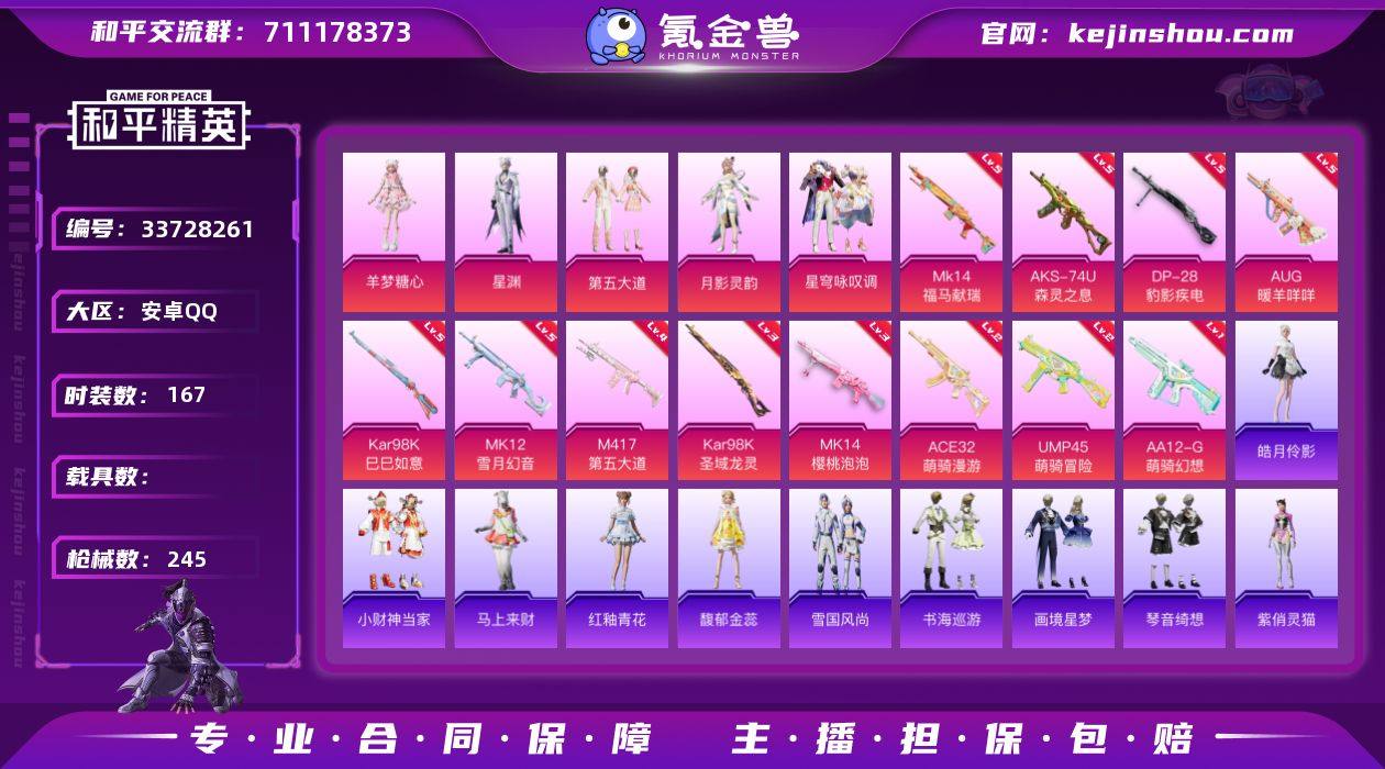 【kyhp2190】安卓 手Q-5粉装-12特效枪-0载具-4粉色飞行器-66374热力值-7王牌印记-167套装-245枪皮 【热门品类】:套装-浪漫天命,套装-龟仙人,套装-粉红小猪 【粉色套装】:粉装-第五大道,角色-月影灵韵,粉装-星穹咏叹调,角色-星渊,角色-羊梦糖心 【粉色枪皮等级】:AUG-暖羊咩咩(五级),ACE32-萌骑漫游(二级),UMP45-萌骑冒险(二级),AKS-74U-森灵之息(五级),Kar98K-巳巳如意(五级),Kar98K-圣域龙灵(三级),Mk14-樱桃泡泡(三级),Mk14-福马献瑞(五级),M417-第五大道(四级),MK12-雪月幻音(五级),AA12-G-萌骑幻想(一级),DP-28-豹影疾电(五级) 【粉色枪皮】:AUG-暖羊咩咩,ACE32-萌骑漫游,UMP45-萌骑冒险,AKS-74U-森灵之息,Kar98K-巳巳如意,Kar98K-圣域龙灵,Mk14-樱桃泡泡,Mk14-福马献瑞,M417-第五大道,MK12-雪月幻音,AA12-G-萌骑幻想,DP-28-豹影疾电 【粉色飞行器】:炫彩糖果飞行器,灵猫魔法师飞行器,极意拳锋飞行器,云梦轻舟飞行器 【粉色降落伞】:第五大道降落伞,镜域双华降落伞,精灵梦叶罗丽降落伞,墨龙九天降落伞,创世·救赎降落伞,临安公主降落伞,樱桃泡泡降落伞,圣域龙灵降落伞,星穹咏叹调降落伞,绯穹魔姬降落伞,异瞳寒姬降落伞,极...