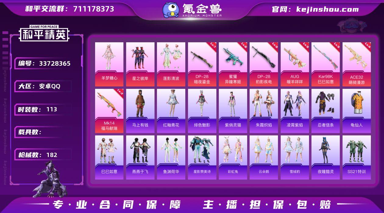113套装/枪械7/装备218/战备116/王牌印记2/热力值47341/五级AUG-暖羊咩咩/六级蜜獾-异瞳寒姬/四级ACE32-萌骑漫游/五级Kar98K-巳巳如意/三级MK14-福马献瑞/七级DP-28-暗夜鎏金/五级DP-28-豹影疾电/忍者信条/龟仙人/星之彼岸/莲影清波/羊梦糖心/AUG-暖羊咩咩/蜜獾-异瞳寒姬/ACE32-萌骑漫游/Kar98K-巳巳如意/MK14-福马献瑞/DP-28暗夜鎏金/DP-28-豹影疾电/极意拳锋飞行器/幻影战神降落伞/旋转彩虹降落伞/第五大道降落伞/金丰海韵降落伞/星穹咏叹调降落伞/冷漠罗丽降落伞/绯穹魔姬降落伞/喜羊羊与灰太狼降落伞/异瞳寒姬降落伞/炫彩糖果降落伞/巳巳如意/马上有钱/燕燕于飞/鱼渊荷华/星影赞美诗/彩虹兔/云朵鹅/雪绒豹/夜瞳黯灵/朱霞炽焰/凌霄紫焰/绯色魅影/紫俏灵猫/雨过天青/红釉青花/AKM-彩虹符号/AKM-星之彼岸/AKM-破晓战魂/AKM-龙的传人/M16A4-红色方程式/SCAR-L-夜灯/SCAR-L-玉兔迎春/SCAR-L-红色方程式/M416-糯团青竹/M416-红色方程式/M416-蓝色火焰/GROZA-田园牧歌/AUG-天降萌叽/AUG-幻影战神/AUG-甜蜜菠萝/AUG-耀粉歌者/QBZ-彩虹符号/M762-天降萌叽/M762-彩虹符号/M762-暗夜鎏金/M762-第五大道/M762-云朵鹅/MK47-炫光之旅/AC-VAL-天降萌叽/AC-VAL-快闪甜心/蜜獾-天降萌叽/ARX...