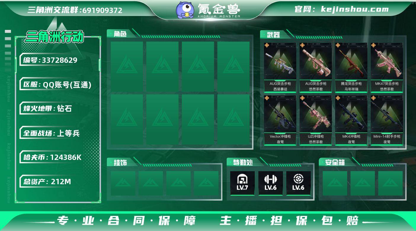 【960163】212m总资产-124386k哈夫币-60烽火等级-钻石-22战场等级-上等兵 【近战皮肤】:近战-黑鹰 【传说外观】:K416突击步枪-行动记录,AUG突击步枪-悠然茶歇,AUG突击步枪-西装暴徒,腾龙突击步枪-马年祥瑞,腾龙突击步枪-万金泪冠,MK47突击步枪-悠然茶歇,Vector冲锋枪-夜莺,UZI冲锋枪-悠然茶歇,勇士冲锋枪-万金泪冠,MK4冲锋枪-夜莺,Mini-14射手步枪-夜莺,M14射手步枪-蛮荒,AWM狙击步枪-万金泪冠,G18-马年祥瑞 【史诗外观】:SVD狙击步枪-檀劫铳影,K416突击步枪-冬日风情,K416突击步枪-腊梅,K437突击步枪-丛影谍踪,SMG-45冲锋枪-阿萨拉特攻,SR-3M紧凑突击步枪-开工大吉,勇士冲锋枪-丛影谍踪,MP7冲锋枪-六套之力,PKM通用机枪-阿萨拉特攻,M249轻机枪-丛影谍踪,M250通用机枪-囚徒,QJB201轻机枪-炽焰,VSS射手步枪-丛影谍踪,SVD狙击步枪-阿萨拉工艺, M14射手步枪-航天庆典,SV-98狙击步枪-囚徒 【稀有外观】:SG552突击步枪-马年新春,SG552突击步枪-贴花艺术, AK-12突击步枪-马年新春,G3战斗步枪-猛禽,CAR-15突击步枪-来财,KC17突击步枪-来财,MP5冲锋枪-弄臣,P90冲锋枪-贴花艺术,SMG-45冲锋枪-行动开启,SR-3M紧凑突击步枪-马年新春,勇士冲锋...