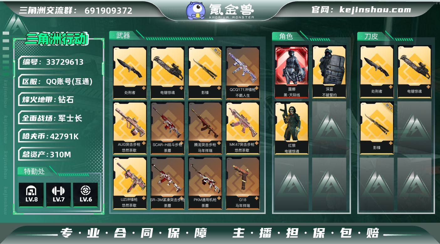 【热门组合搭配,单红+影锋-黑天际线+电锯全套·310M资产】【Q区三端互通】【无二次】YXz9288-特勤处:仓库8级/靶场6级/训练中心7级-总资产310m-哈夫币4279w-烽火等级:60级 【干员外观】:露娜-黑·天际线,深蓝-不破誓约,红狼-电锯惊魂 【近战皮肤】:近战-影锋,近战-电锯惊魂,近战-处刑者1级,近战-黑鹰 【传说外观】:M4A1突击步枪-阿米娅,AUG突击步枪-悠然茶歇,AK-12突击步枪-特斯拉线圈,SCAR-H战斗步枪-启航,SCAR-H战斗步枪-荼蘼,G3战斗步枪-骑士,CAR-15突击步枪-阿米娅,腾龙突击步枪-捞点薯条,腾龙突击步枪-马年祥瑞,腾龙突击步枪-万金泪冠,KC17突击步枪-电锯惊魂,MK47突击步枪-悠然茶歇,UZI冲锋枪-特斯拉线圈,UZI冲锋枪-悠然茶歇,SR-3M紧凑突击步枪-特斯拉线圈,SR-3M紧凑突击步枪-荼蘼,勇士冲锋枪-能天使-午夜邮差,勇士冲锋枪-万金泪冠,QCQ171冲锋枪-不羁人生,S12K霰弹枪-电锯惊魂,PKM通用机枪-荼蘼,M250通用机枪-骑士之心,M14射手步枪-电锯惊魂,M14射手步枪-缄花,SKS射手步枪-骑士,SR-25射手步枪-水墨云图,SR-25射手步枪-缄花,AWM狙击步枪-捞点薯条,AWM狙击步枪-万金泪冠,.357左轮-缄花,G18-马年祥瑞,93R-捞点薯条,复合弓-黑·天际线...