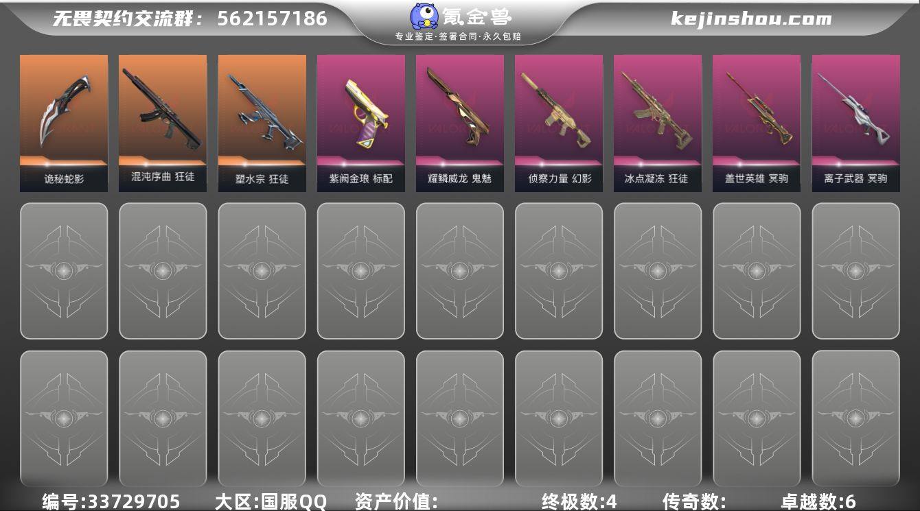 【英雄】:幻棱,炼狱,维斯,暮蝶,钛狐,壹决,铁臂,捷风,雷兹,幽影,不死鸟,贤者,猎枭,蝰蛇,零,芮娜,奇乐,尚勃勒,霓虹,斯凯,夜露,星礈,K/O,海神,盖可,黑梦,钢锁 【近战武器】:近战武器-紫金爪刀,近战武器-诡秘蛇影 军刀 【狂徒】:狂徒-混沌序曲,狂徒-塑水宗,狂徒-冰点凝冻,狂徒-诡秘蛇影 【幻影】:幻影-侦察力量,幻影-末日之翼 【戍卫】:戍卫-折光棱晶 【冥驹】:冥驹-盖世英雄,冥驹-离子武器 【飞将】:飞将-末日之翼 【莽侠】:莽侠-诡秘蛇影 【奥丁】:奥丁-末日之翼 【判官】:判官-诡秘蛇影 【蜂刺】:蜂刺-折光棱晶 【标配】:标配-紫阙金琅,标配-超能偶像,标配-折光棱晶 【正义】:正义-超限闪存,正义-纳米打击 【鬼魅】:鬼魅-耀鳞威龙,鬼魅-诡秘蛇影,鬼魅-星云暗涌 【狂怒】:狂怒-蒙太奇 【短炮】:短炮-末日之翼 【卡面】:终章:激斗汉堡 卡面,进入射程 卡面,《双城之战》拥抱 卡面,精灵大战 卡面,欢迎来到底城 卡面,南瓜盛典 卡面,修车达人 卡面,正义的化身 卡面,铁之华 卡面,时间到 卡面,最高舞台 卡面,音熊登场 卡面,声感陷阱设计图 卡面,梦幻奶茶 卡面,零点嗅探设计图 卡面,无畏契约GO!第一卷:芮娜 卡...
