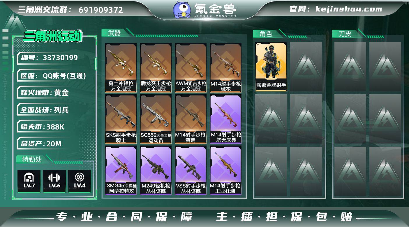【SJC2116】总资产20M/哈夫币38万/传说枪皮数7/战场等级7/行动等级60/安全箱等时效性道具以游戏内数据为准,详情请看图/露娜-金牌射手(S7)/近战-黑鹰/SG552突击步枪-运动员/腾龙突击步枪-万金泪冠/勇士冲锋枪-万金泪冠/M14射手步枪-蛮荒/M14射手步枪-缄花/SKS射手步枪-骑士/AWM狙击步枪-万金泪冠/K416突击步枪-冬日风情/M7战斗步枪-百步穿杨/SCAR-H战斗步枪-囚徒/G3战斗步枪-流沙送葬/AS Val突击步枪-百步穿杨/Vector冲锋枪-百步穿杨/SMG45冲锋枪-阿萨拉特攻/PKM通用机枪-蝮蛇/M249轻机枪-丛林谍踪/M250通用机枪-囚徒/QJB201轻机枪-炽焰/VSS射手步枪-丛林谍踪/M14射手步枪-工业狂潮/M14射手步枪-航天庆典/M700狙击步枪-百步穿杨/AWM狙击步枪-流沙送葬/AUG突击步枪-旧梦/M4A1突击步枪-繁盛/ASh-12战斗步枪-繁盛/K416突击步枪-一帆风顺/SG552突击步枪-2026/SG552突击步枪-马年新春/SG552突击步枪-贴花艺术/G3战斗步枪-主宰/CAR-15突击步枪-来财/MP5冲锋枪-弄臣/SMG-45冲锋枪-行动开启/SR-3M紧凑突击步枪-马年新春/勇士冲锋枪-主宰/勇士冲锋枪-冰天雪地/QCQ171冲锋枪-银鹭/S12K霰弹枪-地狱黑鲨/M249轻机枪-冰天雪地/Mini-14射手步枪-荣耀列队/SKS射手步枪-弄臣/SR-25射手步枪-开...