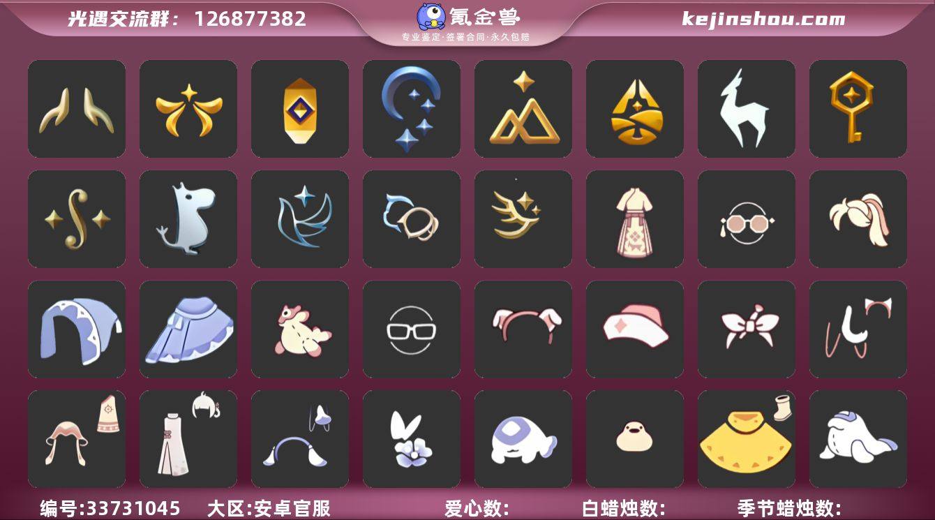 账号类型: 邮箱账号 季节已毕业: 欧若拉季,夜行季,追忆季,拾光季,归巢季,九色鹿季,筑巢季,二重奏季,姆明季,青鸟季,双星季,迁徙季,织光季 完成地图: 晨岛,云野,雨林,霞谷,暮土,禁阁,全图毕业 珍稀物品: 透明蝶翼斗 礼包: 蝙蝠套,巫师,围巾,小狐狸,九色鹿角,大耳狗抱枕,绊爱,大铁头,兔子鞋,大耳狗发饰,肯德基联动,茶桌,白绒金,福娃,灯笼,风之旅人,雪花球,橘子,贝壳,红伞,兔子,雪花,水母,彩虹耳机,新年裤,蝴蝶结,奥利奥,四叶草,暗彩装扮,小提琴,透明蛛丝,新年耳钉,海蓝波浪发型,飞鸟纸伞,日光耳环,遥鲲披肩斗篷,满月耳坠,月华套装,线框斗,姆明饰品套装,树精肩饰,妮妮斗篷,献瑞折扇礼包,渐变双马尾发型礼包,心心相印发饰礼包,小狗周年发饰,立式钢琴礼包,风之旅人白袍,粽子发饰礼包,必胜客联动分享披萨背饰礼包,青衫落拓礼包,周年影院套餐礼包,小黄鸭雨衣套装礼包,小黄鸭发饰礼包,蝴蝶与花发饰礼包,小海牛配饰礼包,海牛玩偶礼包,活力海牛礼包,鹊桥相会套装,日光水母套装礼包,皮皮猫套装礼包,蓝色守护帽礼包,绿茸茸卷耳发饰礼包,紫框眼镜礼包,缀黄画笔发箍礼包,琅骏启岁长裙礼包,幸运亨通眼镜礼包,宝骏丹心马尾礼包,骐骥迎福礼包,金穗披肩斗篷礼包,鎏金魔法帽礼包 裤子: 武士裤,背带...