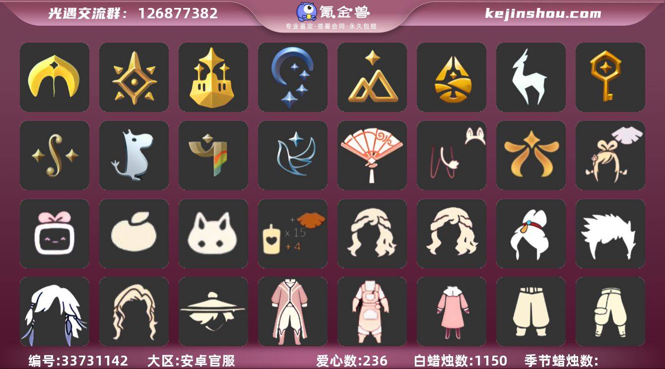 账号类型: 手机账号 季节已毕业: 圣岛季,预言季,梦想季,夜行季,拾光季,归巢季,九色鹿季,筑巢季,二重奏季,姆明季,彩染季,青鸟季 完成地图: 晨岛,雨林,霞谷,暮土 珍稀物品: 鳐鲲斗篷,阿努比斯(狗头),彩虹围巾 礼包: 欧若拉之翼,绊爱,大铁头,橘子,兔子,创始人,海蓝波浪发型,姆明饰品套装,献瑞折扇礼包 裤子: 武士裤,背带裤,搓澡巾,击剑裤,妮妮裙子,飞天裤,筑巢季·裤子,青鸟尊贵蓬头裤子 面具: 阿努比斯,凤凰面具,夜行毕业面具,辉光羚羊面具 面饰: 红耳机,黑框眼镜,青鸟毕业面饰 发型: 归巢毕业发型,若笠,虚荣,小王子发型,飞天盘发,海蓝波浪发型 头饰: 牛仔帽,蓝色音乐会,平顶帽 斗篷: 海洋斗,蟑螂斗,绿芽,粉红绒毛斗篷,彩染围巾斗篷,青鸟毕业斗篷 配饰: 雨伞,筑巢季·小手办,高音钢琴,姆明抱枕,小红伞,相机,二重奏挂画,圆鼓,蓝色手碟 亮点: 【优质装备】:预言季,阿努比斯(狗头),武士裤,青鸟尊贵蓬头裤子(蓝色燕尾服),圣岛季,梦想季,鳐鲲斗篷,归巢毕业发型(五塑彩羽发),筑巢季·小手办(光之子试衣),高音钢琴(白色高脚钢琴),夜行季,妮妮裙子(妮妮长裙),牛仔帽(西部帽),姆明抱枕,小红伞(姆明红伞)(姆明大伞),相机(季卡相机),拾光季,彩虹围巾(五塑彩带斗),归巢季,九色鹿(九色鹿季),飞...