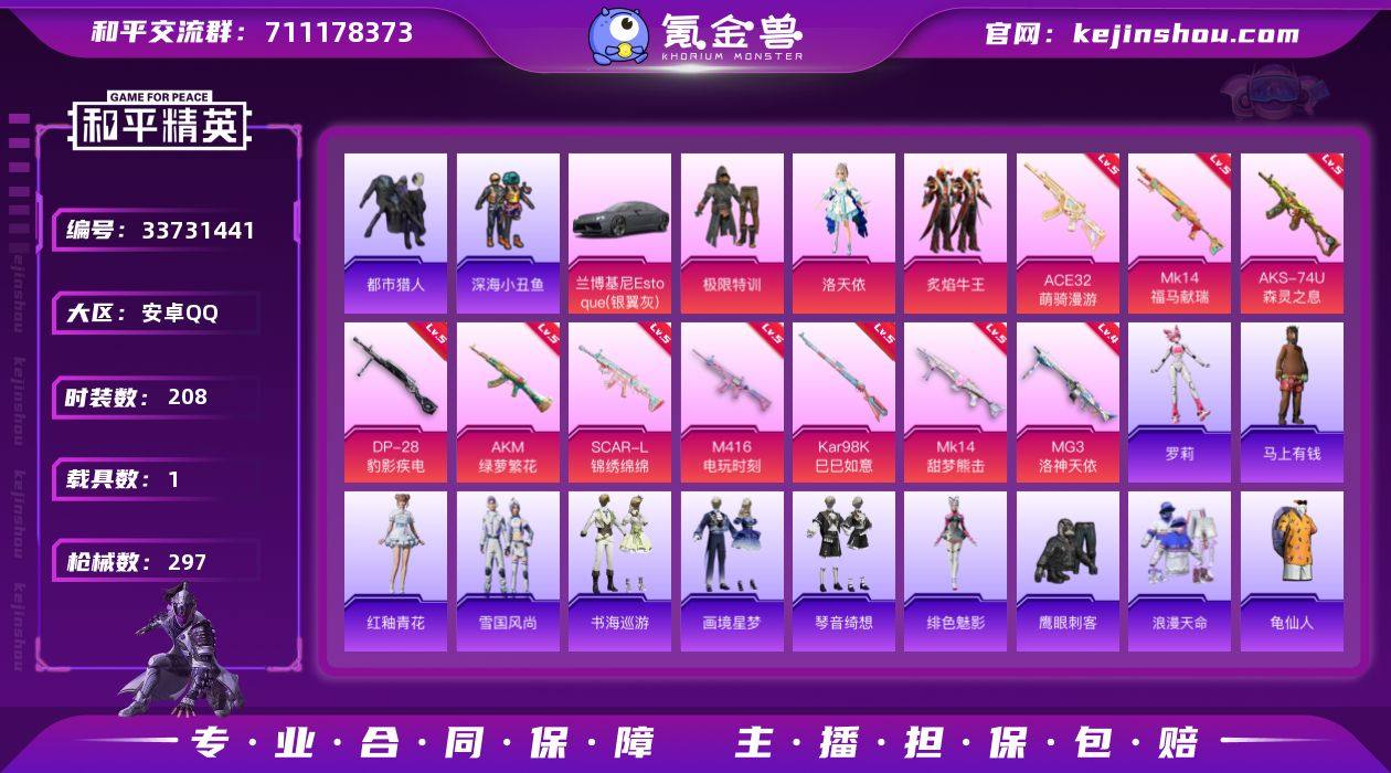 【kyhp1321】安卓 手Q-3粉装-10特效枪-1载具-1粉色飞行器-81794热力值-23王牌印记-208套装-297枪皮 【热门品类】:套装-浪漫天命,套装-都市猎人,套装-深海小丑鱼,套装-龟仙人,套装-暗影哥特,角色-8号机 【粉色套装】:粉装-极限特训,角色-洛天依,粉装-炙焰牛王 【粉色枪皮等级】:AKM-绿萝繁花(五级),SCAR-L-锦绣绵绵(五级),M416-电玩时刻(五级),ACE32-萌骑漫游(五级),AKS-74U-森灵之息(五级),Kar98K-巳巳如意(五级),Mk14-甜梦熊击(五级),Mk14-福马献瑞(五级),DP-28-豹影疾电(五级),MG3-洛神天依(四级) 【粉色载具】:兰博基尼Estoque(银翼灰) 【粉色枪皮】:AKM-绿萝繁花,SCAR-L-锦绣绵绵,M416-电玩时刻,ACE32-萌骑漫游,AKS-74U-森灵之息,Kar98K-巳巳如意,Mk14-甜梦熊击,Mk14-福马献瑞,DP-28-豹影疾电,MG3-洛神天依 【粉色飞行器】:炫彩糖果飞行器 【粉色降落伞】:极限特训降落伞,洛神天依降落伞,黄族统领降落伞,炫彩糖果降落伞 【稀有套装】:套装-龟仙人,套装-巳巳如意,套装-雪国风尚,套装-炫彩糖果,角色-罗莉,套装-马上有钱,套装-雏菊兔兔,套装-萝兰蝴蝶,套装-小熊娃娃,角色-米开朗基罗,套装-糖糖葫芦,套装-青团波波,套装-燕...