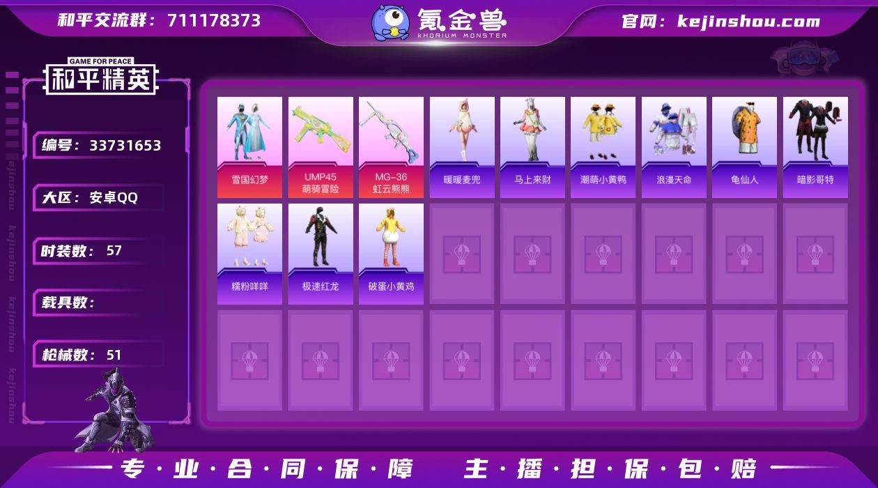 【3粉装】雪国幻梦,角色-月中灵,角色-虹云熊熊【3特效枪】UMP45-萌骑冒险[4级],Mk14-福马献瑞[1级],MG-36-虹云熊熊[3级]【2稀有】浪漫天命,暗影哥特【1飞行器】云朵驼驼飞行器【2头盔】雪国精灵头盔,甜心宝贝头盔【1背包】雪国精灵背包【100其它衣服和枪皮】暖暖麦兜,SS37特训,猎鹰,竞技名士,角色-幽雨猫猫,甜蜜告白,白色伏地魔,黄色伏地魔,角色-极夜星羊,魅力单车,阳光菠萝,黑色伏地魔,长空猛禽,蓝色运动,SS38特训,特训学院,绮丽涂鸦,龙的传人,狙击之神,SS24特训,SS23特训,涂山之恋,完美偶像,潮萌小黄鸭,恋语绒绒,红色运动,糯粉咩咩,红釉青花,燕雀桃枝,SS36特训,耀粉歌者,蓝彩潮人,极速红龙,龟仙人,鹤鸣,雪国风尚,街头潮人,迅捷龙虾,角色-暖阳柴柴,白糯汤圆,猛禽,雨过天青,绯格组合,萌黄之夏,莱茵河畔,疯狂小兔子,破蛋小黄鸡,军械专家,福马献瑞,马上来财,海岛探路者,黄色运动,M249-彩虹符号,莫辛纳甘-乌木金纹,Mk47-虹云熊熊,MP7-G-锦灰蝶梦,GROZA-福马献瑞,S686-生命誓言,AA12-G-雨过天青,Mini14-耀粉歌者,AUG-天降萌叽,汤姆逊-鸢尾珑雾,汤姆逊...