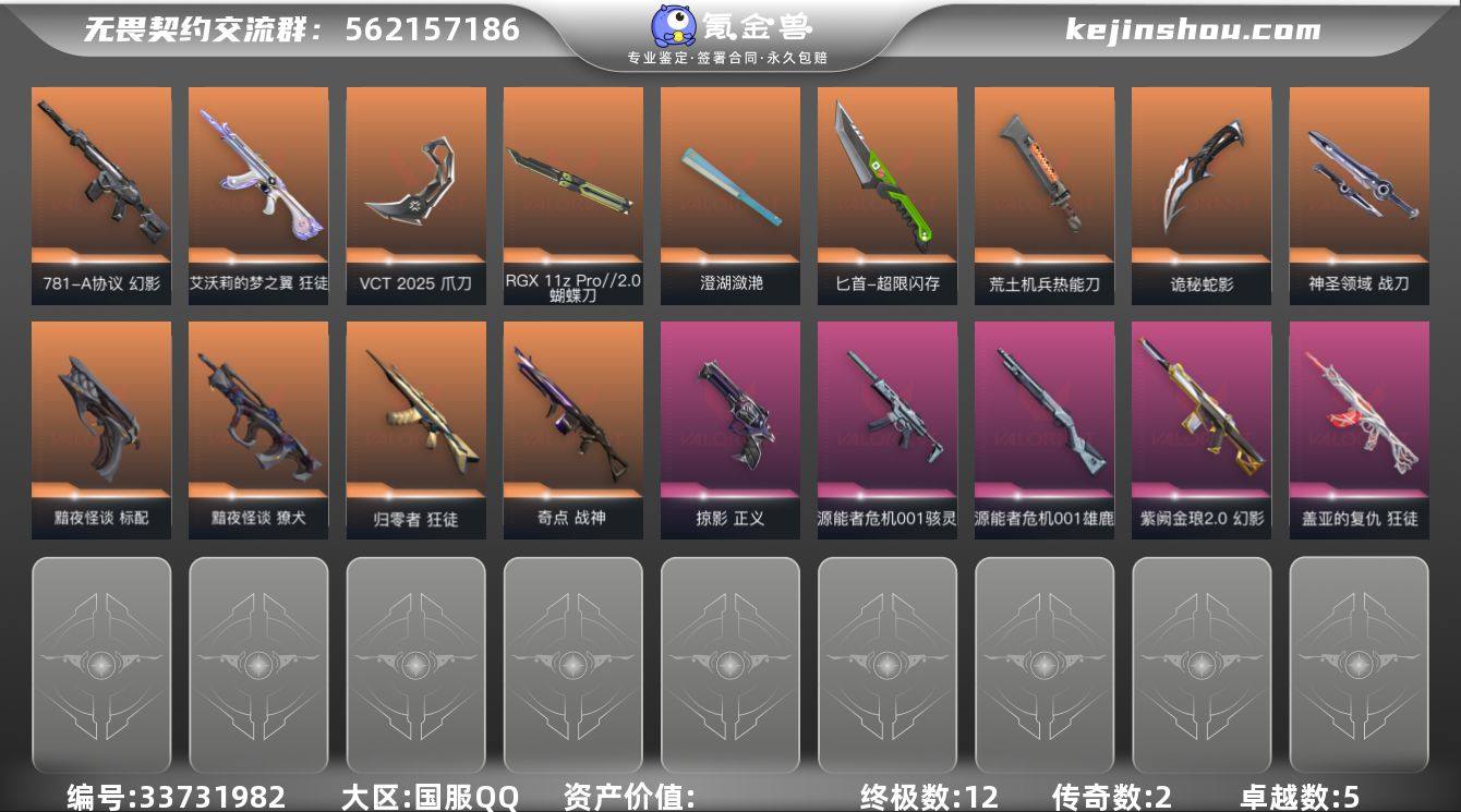 【952504】【套装】:VCT 2025 赛季套装 【英雄】:幻棱,炼狱,维斯,暮蝶,钛狐,壹决,铁臂,捷风,雷兹,幽影,不死鸟,贤者,猎枭,蝰蛇,零,芮娜,奇乐,尚勃勒,霓虹,斯凯,夜露,星礈,K/O,海神,盖可,黑梦,钢锁 【近战武器】:近战武器-RGX 11z Pro//2.0 蝴蝶刀,近战武器-VCT 2025 爪刀,近战武器-紫金爪刀,近战武器-澄湖潋滟,近战武器-超限闪存 匕首,近战武器-荒土机兵 热能刀,近战武器-诡秘蛇影 军刀,近战武器-神圣领域 战刀 【狂徒】:狂徒-归零者,狂徒-艾沃莉的梦之翼,狂徒-盖亚的复仇,狂徒-荒土机兵,狂徒-诡秘蛇影 【幻影】:幻影-781-A协议,幻影-紫阙金琅//2.0,幻影-超限闪存,幻影-神圣领域,幻影-纳米打击,幻影-末日之翼 【戍卫】:戍卫-浮光跃金,戍卫-逆冲蛮牛,戍卫-月球哨兵,戍卫-折光棱晶 【獠犬】:獠犬-黯夜怪谈,獠犬-神圣领域,獠犬-模拟赫兹,獠犬-逆冲蛮牛 【冥驹】:冥驹-荒土机兵,冥驹-模拟赫兹,冥驹-星云暗涌 【飞将】:飞将-末日之翼 【莽侠】:莽侠-超限闪存,莽侠-诡秘蛇影,莽侠-月球哨兵 【战神】:战神-奇点,战神-神圣领域,战神-浮光跃金 【奥丁】:奥丁-纳米打击,奥丁-末日之翼 【判官】:判官-诡秘蛇影,判官...