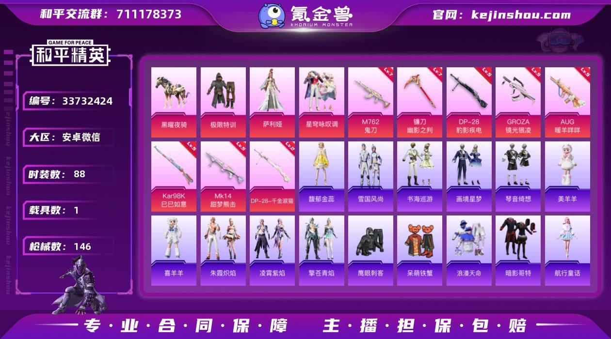 【地铁满天赋 特训 哥特】YXc25429-【可二次】【因赛季更新游戏段付以上号为准!】 安卓V-1稀有1载具3粉装8特效枪8热门88套装146枪皮 7印记 历史超级王牌12星 【1稀有】 浪漫天命 【1载具】 黑曜夜骑 【3粉装】 萨利娅 星穹咏叹调 极限特训 【8特效枪】 Kar98K-巳巳如意 (5级) M762-鬼刀 (7级) DP-28-千金淑猫 (2级) DP-28-豹影疾电 (5级) AUG-暖羊咩咩 (5级) Mk14-甜梦熊击 (5级) GROZA-镜光银凌 (5级) 镰刀-幽影之判 (7级) 【8热门】 呆萌铁蟹 鹰眼刺客 暗影哥特 漫步者 AKM-奇异狩猎者 M762-奇异狩猎者 M24-奇异狩猎者 S686-奇异狩猎者 【2头盔】 梦幻火箭头盔 幻影战神头盔 【2背包】 梦幻火箭背包 深海小丑鱼背包