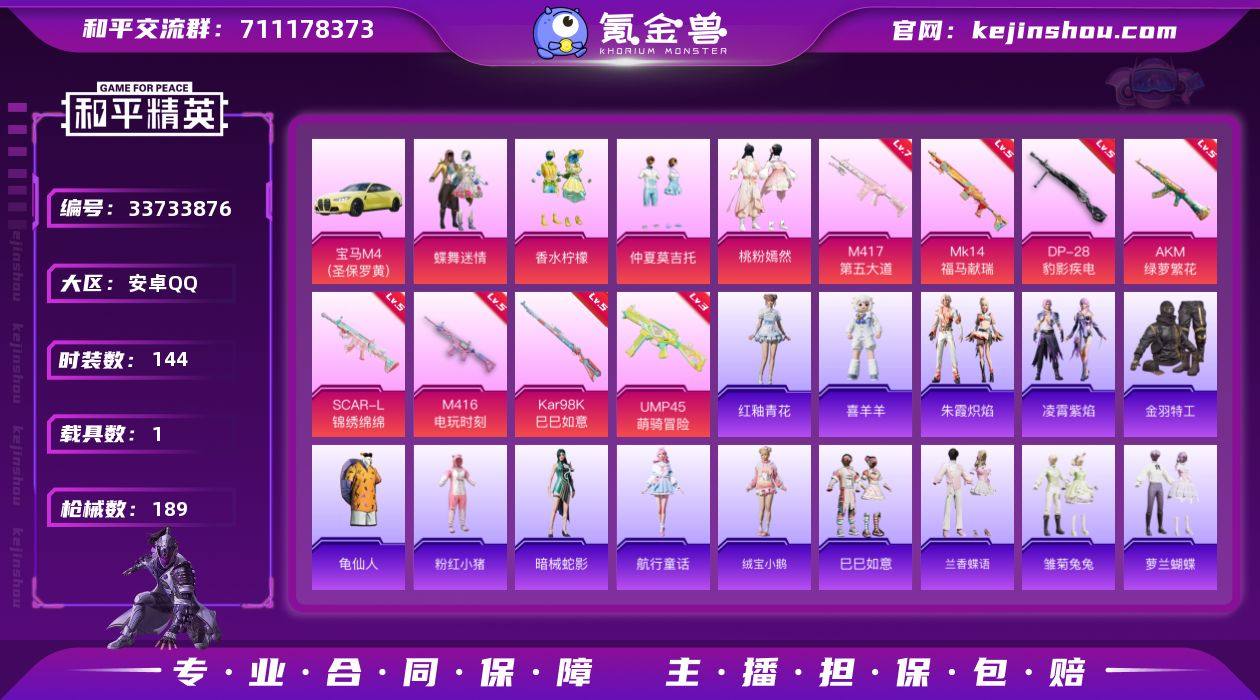 【kyhp1289】安卓 手Q-4粉装-8特效枪-1载具-1粉色飞行器-60062热力值-8王牌印记-144套装-189枪皮 【热门品类】:套装-金羽特工,套装-龟仙人,套装-粉红小猪 【粉色套装】:粉装-蝶舞迷情,粉装-香水柠檬,粉装-仲夏莫吉托,粉装-桃粉嫣然 【粉色枪皮等级】:AKM-绿萝繁花(五级),SCAR-L-锦绣绵绵(五级),M416-电玩时刻(五级),UMP45-萌骑冒险(三级),Kar98K-巳巳如意(五级),Mk14-福马献瑞(五级),M417-第五大道(七级),DP-28-豹影疾电(五级) 【粉色载具】:宝马M4(圣保罗黄) 【粉色枪皮】:AKM-绿萝繁花,SCAR-L-锦绣绵绵,M416-电玩时刻,UMP45-萌骑冒险,Kar98K-巳巳如意,Mk14-福马献瑞,M417-第五大道,DP-28-豹影疾电 【粉色飞行器】:炫彩糖果飞行器 【粉色降落伞】:春暖花开降落伞,荧光虫舞降落伞,旋转彩虹降落伞,第五大道降落伞,魔法神域降落伞,智耀战神降落伞,炫彩糖果降落伞 【稀有套装】:套装-龟仙人,套装-暗械蛇影,套装-航行童话,套装-绒宝小鹅,套装-巳巳如意,套装-兰香蝶语,套装-雏菊兔兔,套装-萝兰蝴蝶,套装-糖糖葫芦,套装-青团波波,套装-棉花软糖,角色-俏兔智灵,套装-燕燕于飞,套装-鱼渊荷华,套装-粉恋花,套装-紫幽梦,套装-蓝冰羽...