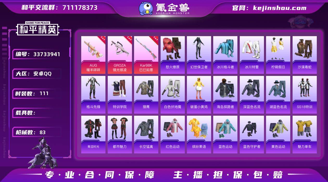 王者一体号(王者135皮肤4传说)-5特效枪满级-地铁天赋-无二次协助-20624热力值-1王牌印记-56套装-83枪皮【特效枪等级】:AUG-暖羊咩咩(五级- AUG-暖羊咩咩)GROZA-镜光银凌(五级- GROZA-镜光银凌)Kar98K-巳巳如意(五级- Kar98K-巳巳如意)【优质武器皮肤】: AUG-暖羊咩咩 GROZA-镜光银凌 Kar98K-巳巳如意【稀有武器皮肤】: AUG-暖羊咩咩 GROZA-镜光银凌 Kar98K-巳巳如意 野牛-雏菊兔兔 Mk14-冰河战士 平底锅-雏菊兔兔 M762-雏菊兔兔 Mini14-雏菊兔兔 R1895-雏菊兔兔 M16A4-冰河战士 20-H-乌木金纹 G36C-桃粉嫣然 PKM-紫幽梦 Mk14-紫幽梦 蜜獾-乌木金纹 S1897-紫幽梦 P92-紫幽梦 PKM-啾咪啾咪 M416-红色方程式 M416-糯团青竹 AKM-龙的传人 AKM-虎虎生威 SCAR-L-玉兔迎春 SCAR-L-暗夜玫瑰 GROZA-彩虹符号 AUG-耀粉歌者 M762-彩虹符号 M762-天降萌叽 Mk47-乌木金纹 G36C-乌木金纹 Kar98K-彩虹符号 M24-乌木金纹 AWM-天降萌叽 莫辛纳甘-乌木金纹 SKS-炫彩节奏 Mk14-治愈之星 UZI-天降萌叽 UZI-啾咪啾咪 UMP45-夜灯 Vector-生命誓言 Vector-彩虹符号 汤姆逊-天降萌叽 野牛-乌木金纹 S12K-夜灯 MG3-幻世战舞者 平底锅-光之冒险 撬棍-环太平洋 20-H-净心行者 野牛-燕燕于飞 M200-乌...