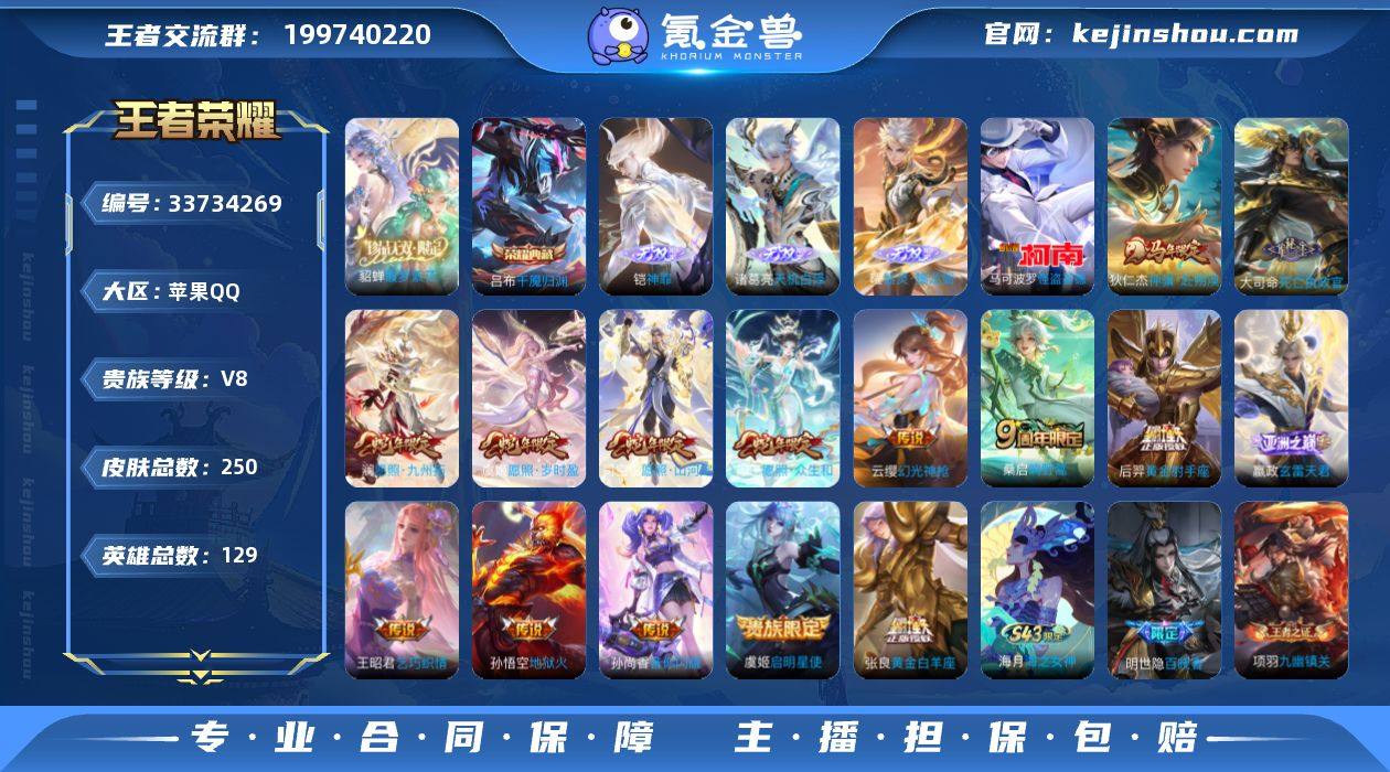【王者荣耀】珍品无双1 典藏1 无双4 珍品传说1 传说17 史诗69 英雄129 皮肤250 贵族8级 珍品无双:馥梦繁花__荣耀典藏:千魇归渊__无双皮肤:群星魔术团|器灵·螭龙剑|天机白泽|神罪__珍品传说:怪盗基德__传说皮肤:鸣野蒿|音你闪耀|启明星使|地狱火|黄金射手座|黄金白羊座|刘备-时之恋人|乞巧织情|战鼓燎原|玄雷天君|幻光神枪|愿照·岁时盈|愿照·山河定|愿照·九州拓|愿照·众生和|死亡执政官|神骥·赴朔漠__稀有限定:至尊宝|大圣娶亲|引擎之心|蔷薇恋人|龙胆|傲雪梅枪|山海·玄木吟|时之彼端|拒霜思|百解令|大漠名商|古海寻踪|海滩派对|海盐诗旅|皇家上将|江河有灵|美猴王|魔术师|匿光侦查者|奇幻香踪|擒涛扼浪|探海日志|天穹祈灯|无心|五谷丰年|阴阳师|驭风魔法|暗隐猎兽者|冰冠公主|冰雪圆舞曲|乘风破浪|德古拉伯爵|地狱岩魂|功夫厨神|鬼剑武藏|唤灵魅影|黄金分割率|箭羽风息|节奏热浪|金属风暴|吕布-末日机甲|魅力维加斯|魅语|偶像歌手|青蛇|赏金猎手|绅士熊喵|圣诞狂欢|水果甜心|水晶猎龙者|天才门将|晚萤|赵云-未来纪元|星夜王子|摇滚巨星|鹰眼统帅|幽灵船长|逐浪之夏|紫霞仙子|陌上桑|谪仙醉月|噬灭天穹|破空之剑|修罗|曙光守护者|千年之狐|刘备-百相守梦|特工魅影|星界战将|谧...