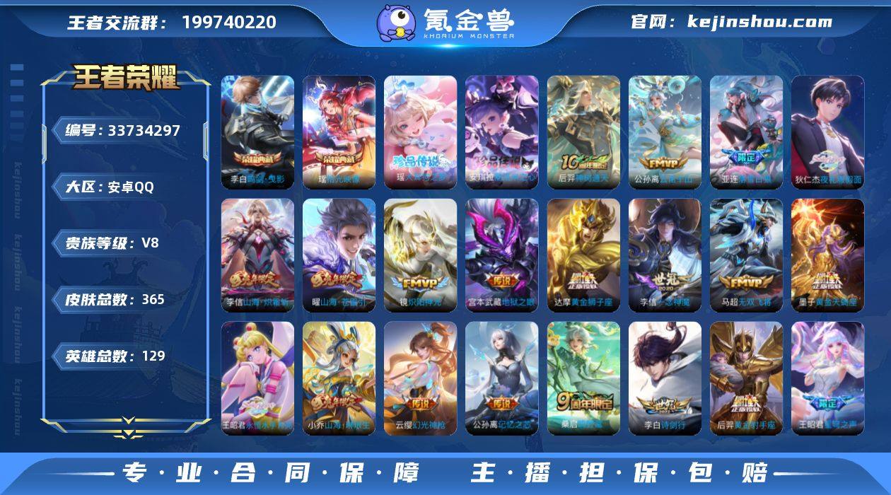 【王者荣耀】珍品无双0 典藏2 无双0 珍品传说2 传说24 史诗103 英雄129 皮肤365 贵族8级 荣耀典藏:鸣剑·曳影|拾光映像__珍品传说:大耳狗之梦|酷洛米之心__传说皮肤:鸣野蒿|无双飞将|炽阳神光|启明星使|地狱之眼|黄金狮子座|黄金射手座|一念神魔|记忆之芯|孙尚香-末日机甲|黄金天蝎座|落雪白狼|马超-琥珀纪元|诗剑行|星穹之声|夜礼服假面|永恒水手月亮|逐花归海|山海·苍雷引|山海·炽霜斩|山海·琳琅生|幻光神枪|云诺千山|神树通天__稀有限定:至尊宝|蔷薇恋人|神威|龙胆|李小龙|梁祝|山海·碧波行|山海·玄木吟|时之彼端|拒霜思|暗影游猎|大漠名商|地狱燃心|电玩高手|繁星吟游|凤凰于飞|高山流水|古海寻踪|海滩派对|海盐诗旅|航海奇遇记|胡桃夹子|胡桃异想国|华丽摇滚|幻夜卜梦|皇家上将|混沌棋|火炮绅士|剑破天穹|江河有灵|金庭之子|狂想玩偶喵|黎明之约|迷踪丽影|魔术师|千军破阵|擒涛扼浪|青焰无极|驱傩正仪|燃音魔法|荣光圣徽|沙漠行僧|朔风刀|死亡摇滚|探海日志|醍醐杖|天狼绘梦者|天穹祈灯|玩趣恶龙|万华元夜|妄想食味|无心|五谷丰年|午后时光|纤云弄巧|星界游侠|星空之诺|演武夺筹|夜都怪侠|疑决卦|阴阳师|吟游魔法|银河之约|遇见飞天|原初追逐者|云间偶戏|真爱魔法|暗夜贵...