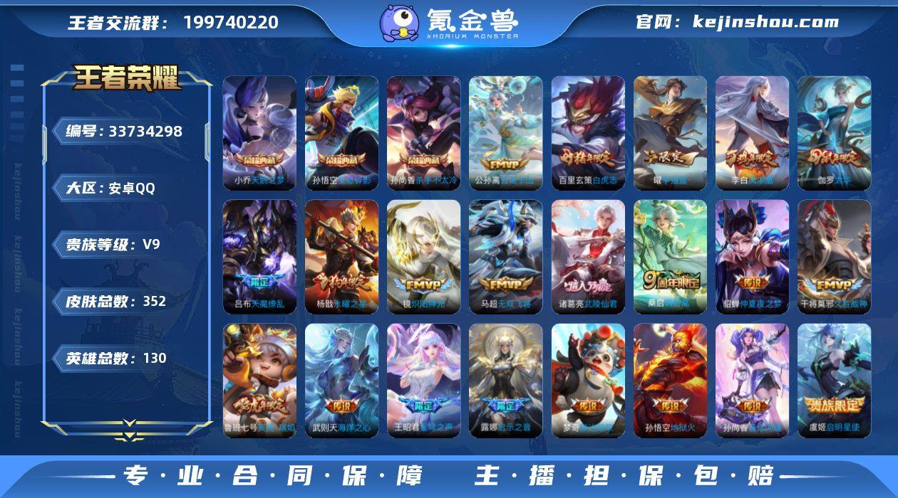 【王者荣耀】珍品无双0 典藏4 无双0 珍品传说0 传说25 史诗110 英雄130 皮肤352 贵族9级 荣耀典藏:全息碎影|天鹅之梦|杀手不太冷|武则天__传说皮肤:鸣野蒿|音你闪耀|无双飞将|启示之音|炽阳神光|启明星使|胖达荣荣|地狱火|海洋之心|仲夏夜之梦|久胜战神|狄仁杰-超时空战士|李逍遥|瑶-时之祈愿|白虎志|凤求凰|太华|天魔缭乱|武陵仙君|小乔-音你心动|星穹之声|寅虎·瑞焰|永曜之星|周瑜-音你心动|云诺千山__稀有限定:寅虎·心曲|白晶晶|至尊宝|青龙志|朱雀志|大圣娶亲|一生所爱|岱宗|玄嵩|幽恒|飞衡|蔷薇恋人|神威|猪悟能|玉兔公主|李小龙|梁祝|时之彼端|狮舞东方|白昼王子|百木心枪|冰锋战神|冰霜恋舞曲|嫦娥-如梦令|大漠名商|繁星吟游|古海寻踪|海滩派对|海盐诗旅|后羿-如梦令|华丽摇滚|幻夜卜梦|皇家上将|辉光之辰|混沌棋|火炮绅士|剑破天穹|金庭之子|凯尔特女王|狂想玩偶喵|蓝屏警告|炼金王|迷踪丽影|魔术师|匿光决锋者|匿光破解者|奇幻香踪|千军破阵|擒涛扼浪|穷奇|驱傩正仪|荣光圣徽|沙漠行僧|朔风刀|死亡摇滚|探海日志|饕餮|醍醐杖|天穹祈灯|万华元夜|五谷丰年|纤云弄巧|星空之诺|驯魔猎人|演武夺筹|妖精王|夜都怪侠|疑决卦|阴阳师|吟游魔法|银河之约|优雅恋人|游园惊梦|遇...