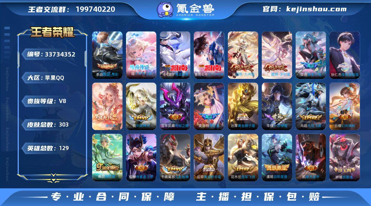 【王者荣耀】珍品无双0 典藏1 无双1 珍品传说3 传说20 史诗93 英雄129 皮肤303 贵族4级 荣耀典藏:鸣剑·曳影__无双皮肤:群星魔术团__珍品传说:江户川柯南|怪盗基德|大耳狗之梦__传说皮肤:鸣野蒿|无双飞将|绛天战甲|炽阳神光|启明星使|地狱之眼|仲夏夜之梦|久胜战神|黄金狮子座|黄金射手座|一念神魔|冠军飞将|浮生妄|落雪白狼|夜礼服假面|逐花归海|幻光神枪|愿照·岁时盈|愿照·九州拓|续相思__稀有限定:至尊宝|神威|孙行者|梁祝|山海·玄木吟|拒霜思|百解令|大漠名商|地狱燃心|高山流水|古海寻踪|海滩派对|海盐诗旅|航海奇遇记|胡桃异想国|皇家上将|剑破天穹|江河有灵|金庭之子|蓝屏警告|黎明之约|迷踪丽影|魔术师|千军破阵|擒涛扼浪|青焰无极|驱傩正仪|燃音魔法|荣光圣徽|沙漠行僧|探海日志|天穹祈灯|玩趣恶龙|万华元夜|妄想食味|无心|五谷丰年|纤云弄巧|演武夺筹|阴阳师|原初追逐者|暗夜贵公子|暗隐猎兽者|缤纷独角兽|冰雪圆舞曲|乘风破浪|大乔-猫狗日记|德古拉伯爵|地狱岩魂|电玩·爆裂旋风|伽罗-琥珀纪元|功夫厨神|鬼剑武藏|黄金分割率|节奏热浪|金属风暴|李元芳-蔬乡物语|吕布-末日机甲|魅力维加斯|魅语|梦奇-顽趣|女仆咖啡|偶像歌手|青蛇|赏金猎手|绅士熊喵|圣诞狂欢|圣诞恋...