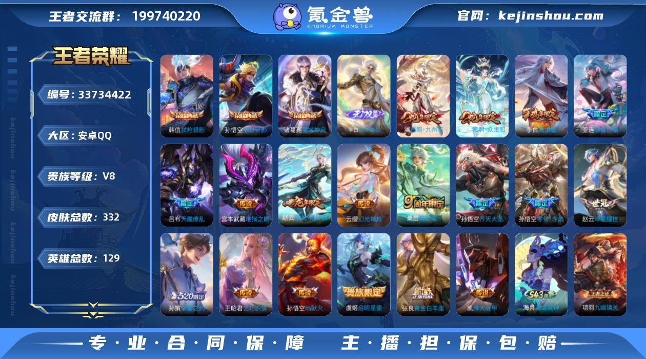 【王者荣耀】珍品无双0 典藏3 无双2 珍品传说0 传说20 史诗99 英雄129 皮肤332 贵族8级 荣耀典藏:全息碎影|弑枪猎影|星域神启__无双皮肤:群星魔术团|碎月剑心__传说皮肤:鸣野蒿|挚爱之约|绛天战甲|启明星使|地狱之眼|地狱火|黄金白羊座|乞巧织情|淬星耀世|齐天大圣|凤求凰|零号·赤焰|落雪白狼|天魔缭乱|战鼓燎原|乘龙·铭钟鼎|幻光神枪|愿照·九州拓|愿照·众生和__稀有限定:至尊宝|玄武志|朱雀志|大圣娶亲|引擎之心|飞衡|孙行者|猪悟能|李小龙|梁祝|唐三藏|拒霜思|百解令|大漠名商|繁星吟游|高山流水|古海寻踪|海滩派对|海盐诗旅|皇家上将|混沌棋|剑破天穹|江河有灵|金庭之子|凯尔特女王|黎明之约|魔术师|女武神|千军破阵|擒涛扼浪|穷奇|驱傩正仪|荣光圣徽|沙漠行僧|朔风刀|死亡摇滚|探海日志|饕餮|醍醐杖|天穹祈灯|万华元夜|王者之锤|妄想食味|无心|五谷丰年|纤云弄巧|演武夺筹|疑决卦|阴阳师|优雅恋人|游园惊梦|遇见飞天|御旌|御銮|御狮|原初追逐者|真爱魔法|暗夜贵公子|暗夜猫娘|暗隐猎兽者|白蛇|缤纷独角兽|冰冠公主|冰雪圆舞曲|苍穹之光|乘风破浪|大乔-猫狗日记|德古拉伯爵|地狱岩魂|电玩·爆裂旋风|电玩小子|伽罗-琥珀纪元|功夫厨神|鬼剑武藏|黄金分割率|节奏热浪|金属风暴...