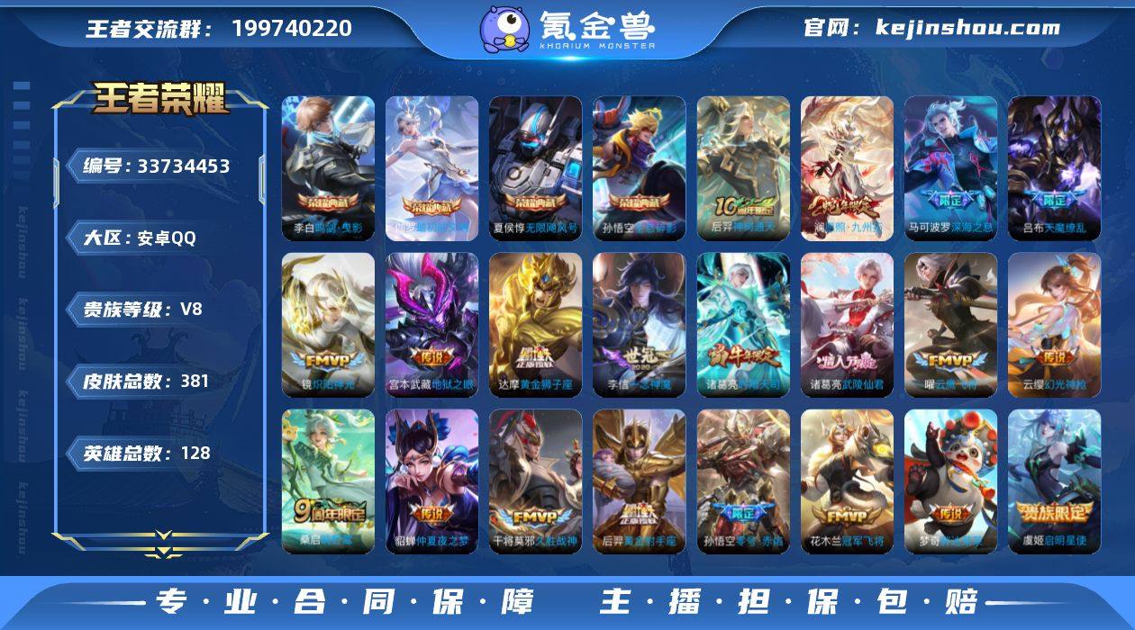 【王者荣耀】珍品无双0 典藏4 无双0 珍品传说0 传说22 史诗104 英雄128 皮肤381 贵族8级 荣耀典藏:无限飓风号|全息碎影|鸣剑·曳影|最初的交响__传说皮肤:鸣野蒿|深海之息|绛天战甲|炽阳神光|启明星使|胖达荣荣|地狱之眼|仲夏夜之梦|久胜战神|黄金狮子座|黄金射手座|一念神魔|云鹰飞将|冠军飞将|孙尚香-末日机甲|零号·赤焰|时雨天司|天魔缭乱|武陵仙君|幻光神枪|愿照·九州拓|神树通天__稀有限定:奔雷神使|至尊宝|朱雀志|岱宗|飞衡|蔷薇恋人|虎魄|神威|烈魂|龙胆|孙行者|猪悟能|李小龙|梁祝|狮舞东方|拒霜思|暗影游猎|冰霜恋舞曲|大漠名商|电玩高手|繁星吟游|高山流水|古海寻踪|海滩派对|海盐诗旅|航海奇遇记|后羿-如梦令|胡桃异想国|幻夜卜梦|皇家上将|混沌棋|火炮绅士|剑破天穹|金庭之子|凯尔特女王|狂想玩偶喵|蓝屏警告|黎明之约|炼金王|迷踪丽影|魔术师|千军破阵|擒涛扼浪|穷奇|驱傩正仪|荣光圣徽|沙漠行僧|蜃楼王|朔风刀|探海日志|饕餮|醍醐杖|天狼狩猎者|天狼溯光者|天穹祈灯|玩趣恶龙|万华元夜|王者之锤|无心|五谷丰年|午后时光|纤云弄巧|项羽-霸王别姬|星空之诺|驯魔猎人|演武夺筹|妖精王|夜都怪侠|疑决卦|阴阳师|吟游魔法|银河之约|遇见飞天|御旌|御銮|御狮|原初追逐者...