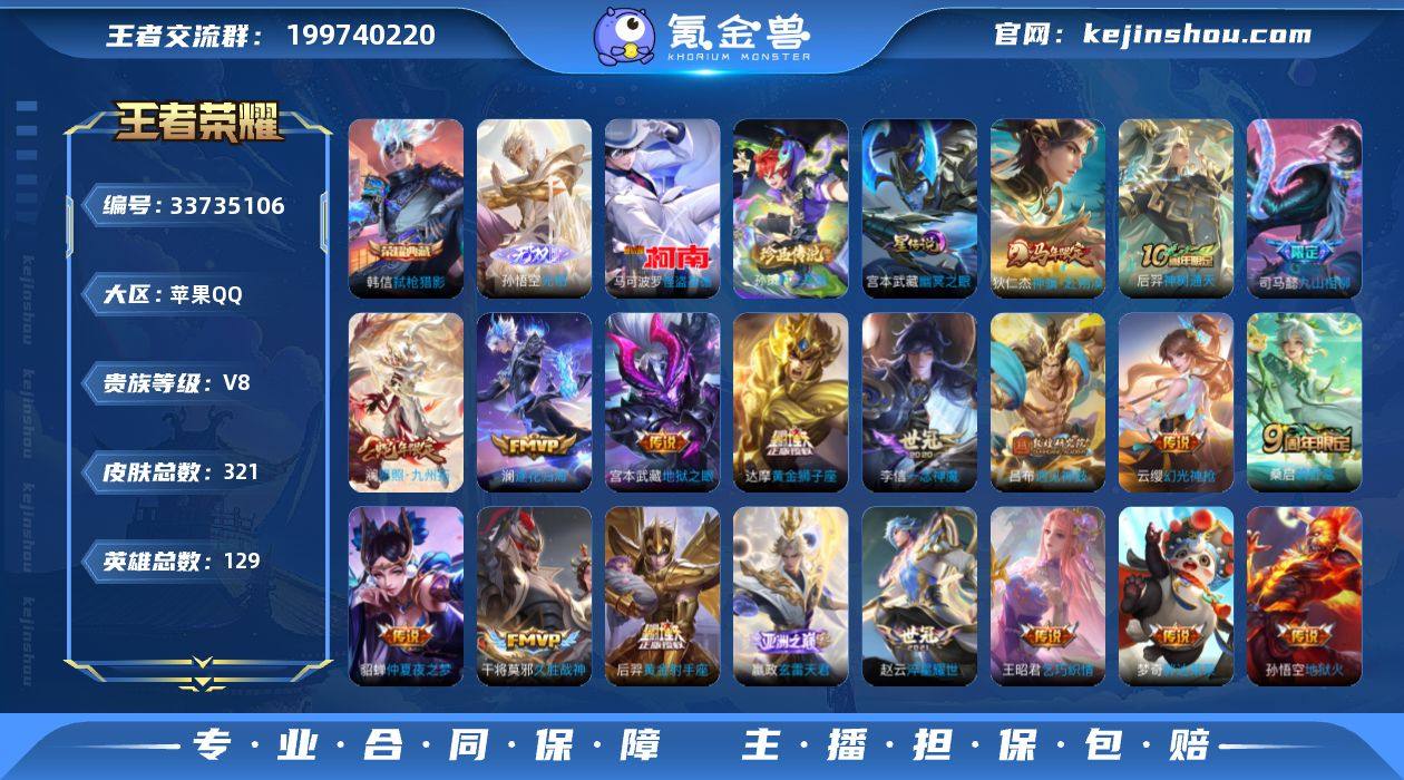 【LWZC3870】可二次【特价出售/店主推荐】苹果Q-V8-至尊星耀III段位-129英雄-321皮肤-1典藏皮肤-1无双-2珍品传说-1星传说-22传说-93史诗 【英雄全皮】:刘禅全皮,司马懿全皮,孙权全皮,敖隐全皮,莱西奥全皮,影全皮 【荣耀典藏】:韩信弑枪猎影 【无双皮肤】:孙悟空无相 【珍品传说】:孙策时之奇旅,马可波罗怪盗基德 【传说皮肤】:狄仁杰神骥赴朔漠,后羿神树通天,司马懿九山相柳,澜愿照九州拓,云缨幻光神枪,嬴政玄雷天君,桑启鸣野蒿,澜逐花归海,吕布遇见神鼓,赵云淬星耀世,王昭君乞巧织情,铠绛天战甲,虞姬启明星使,李信一念神魔,张良黄金白羊座,干将莫邪久胜战神,达摩黄金狮子座,梦奇胖达荣荣,后羿黄金射手座,貂蝉仲夏夜之梦,宫本武藏地狱之眼,孙悟空地狱火 【限定皮肤】:暃埋骨钱,姜子牙天穹之誓,杨戬破阵退雄兵,李白谪仙醉月,狄仁杰阴阳师,赵云皇家上将,孙尚香蔷薇恋人,庄周高山流水,吕布遇见神鼓,元歌无心,甄姬游园惊梦,狄仁杰魔术师,狄仁杰万华元夜,达摩沙漠行僧,项羽海滩派对,老夫子醍醐杖,程咬金演武夺筹,兰陵王金庭之子,孙悟空孙行者,李元芳云中旅人,虞姬启明星使,钟馗驱傩正仪,杨戬潮玩骑兵,干将莫邪胡桃夹子,...