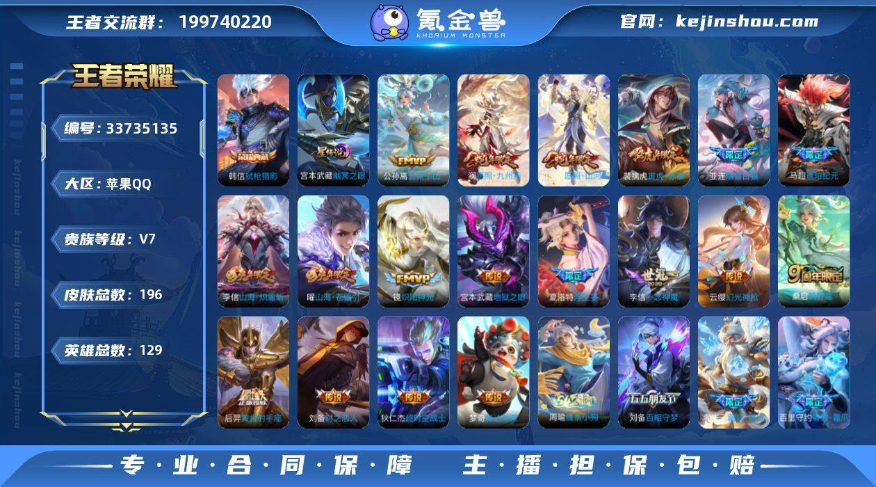 可换绑【精品多限定高质量账号·韩信典藏·蛇年澜司空震·落雪白狼·琥珀纪元·浮生妄·兔年李信曜·虎年老虎·孙行者·白晶晶·瑞麟志】 9按键,1星传说,6王者印记,五级铭文180,可二次,苹果Q-V7-196皮肤-1典藏皮肤-18传说-52史诗【英雄全皮】:孙权全皮【荣耀典藏】:韩信弑枪猎影【星元皮肤】:宫本武藏幽冥之眼【传说皮肤】:公孙离云诺千山,司空震愿照山河定,澜愿照九州拓,云缨幻光神枪,桑启鸣野蒿,亚连落雪白狼,马超琥珀纪元,夏洛特浮生妄,曜山海苍雷引,李信山海炽霜斩,裴擒虎寅虎赤拳,镜炽阳神光,李信一念神魔,刘备时之恋人,梦奇胖达荣荣,后羿黄金射手座,宫本武藏地狱之眼,狄仁杰超时空战士【限定皮肤】:姜子牙天穹之誓,狄仁杰阴阳师,赵云皇家上将,孙尚香蔷薇恋人,庄周高山流水,高渐离玩趣恶龙,芈月白晶晶,元歌云间偶戏,元歌无心,马可波罗山海玄木吟,狄仁杰魔术师,狄仁杰万华元夜,达摩沙漠行僧,项羽海滩派对,老夫子圣诞老人,老夫子醍醐杖,程咬金演武夺筹,兰陵王金庭之子,花木兰瑞麟志,亚瑟潮玩骑士王,孙悟空孙行者,刘备百相守梦,李元芳云中旅人,钟馗驱傩正仪,鬼谷子原初探秘者,鬼谷子五谷丰年,苏烈千军破阵,沈梦溪大漠名商,明...
