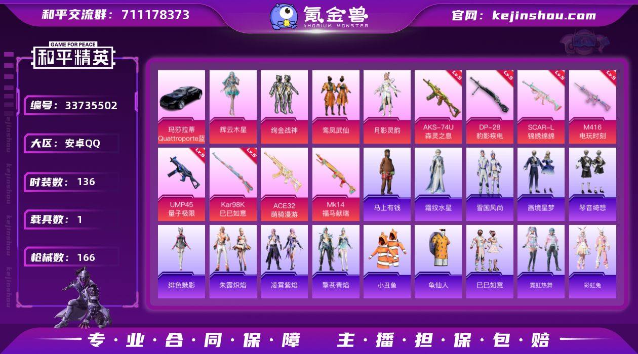 【LHPD445】【店主推荐捡漏号!可直接换绑】安卓 手Q-4粉装-8特效枪-1载具-2粉色飞行器-51115热力值-12王牌印记-136套装-166枪皮【热门品类】:套装-小丑鱼,套装-龟仙人【粉色套装】:粉装-绚金战神,粉装-鸾凤武仙,角色-月影灵韵,角色-辉云木星【粉色枪皮等级】:SCAR-L-锦绣绵绵(五级),M416-电玩时刻(五级),UMP45-量子极限(五级),AKS-74U-森灵之息(五级),Kar98K-巳巳如意(五级),DP-28-豹影疾电(五级)【粉色载具】:玛莎拉蒂Quattroporte(夜幕蓝)【粉色枪皮】:SCAR-L-锦绣绵绵,M416-电玩时刻,ACE32-萌骑漫游,UMP45-量子极限,AKS-74U-森灵之息,Kar98K-巳巳如意,Mk14-福马献瑞,DP-28-豹影疾电【粉色飞行器】:炫彩糖果飞行器,镜光幻境飞行翼