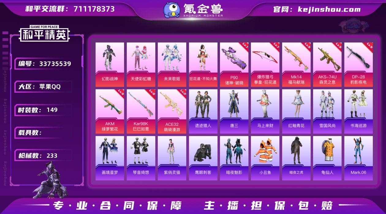 苹果 手Q-4粉装-8特效枪-0载具-3粉色飞行器-62783热力值-13王牌印记-149套装-233枪皮 【热门品类】:套装-小丑鱼,套装-暗夜之虎,套装-龟仙人,角色-Mark.06 【粉色套装】:粉装-幻影战神,粉装-天使彩虹糖,粉装-未来歌姬,角色-狂花道·不知火舞 【粉色枪皮等级】:AKM-绿萝繁花(五级),ACE32-萌骑漫游(二级),AKS-74U-森灵之息(五级),P90-诸神·破晓(七级),Kar98K-巳巳如意(五级),Mk14-福马献瑞(五级),DP-28-豹影疾电(五级),爆炸猎弓-拳皇·狂花道(七级) 【粉色枪皮】:AKM-绿萝繁花,ACE32-萌骑漫游,AKS-74U-森灵之息,P90-诸神·破晓,Kar98K-巳巳如意,Mk14-福马献瑞,DP-28-豹影疾电,爆炸猎弓-拳皇·狂花道 【粉色飞行器】:炫彩糖果飞行器,歌者泠鸢飞行器,黄族统领飞行器 【粉色降落伞】:甜心宝贝降落伞,旋转彩虹降落伞,歌者泠鸢降落伞,圣堂之誓降落伞,初号机 觉醒Ver.降落伞,拳皇·狂花道降落伞,千金淑猫降落伞,极意拳锋降落伞,炫彩糖果降落伞 【稀有套装】:套装-龟仙人,套装-巳巳如意,套装-雪国风尚,套装-炫彩糖果,套装-马上来财,套装-遗迹猎人,套装-雏菊兔兔,套装-萝兰蝴蝶,角色-狂花道·娜可露露,角色-狂花道·雅典娜,套装-燕燕于飞,套装-...