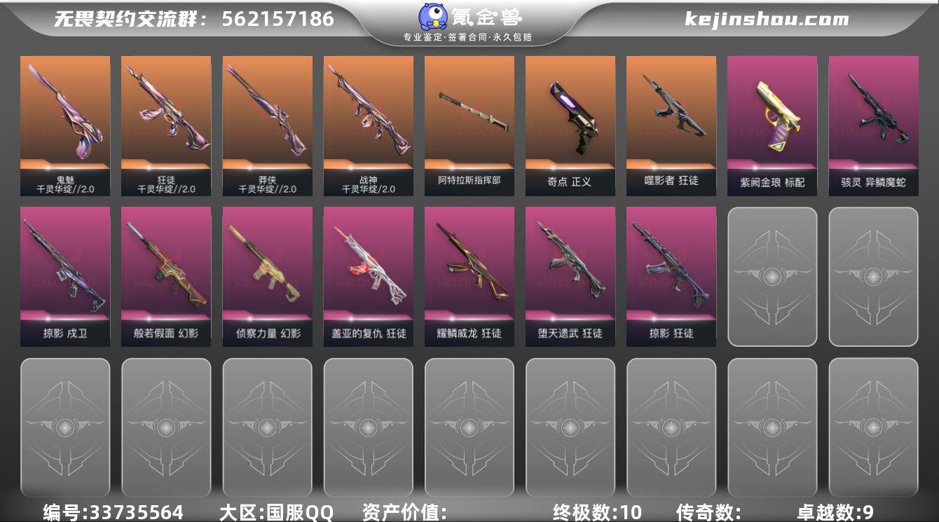 【960281】【套装】:千灵华绽//2.0套装 【英雄】:炼狱,暮蝶,壹决,捷风,不死鸟,贤者,猎枭,芮娜,奇乐,斯凯,黑梦 【近战武器】:近战武器-蒙太奇 战斧,近战武器-碎心裂刃,近战武器-流风回雪,近战武器-阿特拉斯指挥部 甩棍 【狂徒】:狂徒-噬影者,狂徒-千灵华绽//2.0,狂徒-堕天遗武,狂徒-掠影,狂徒-盖亚的复仇,狂徒-耀鳞威龙 【幻影】:幻影-般若假面,幻影-侦察力量,幻影-蒙太奇 【戍卫】:戍卫-掠影 【莽侠】:莽侠-千灵华绽//2.0 【战神】:战神-千灵华绽//2.0,战神-蒙太奇 【骇灵】:骇灵-异鳞魔蛇,骇灵-蒙太奇 【标配】:标配-紫阙金琅 【正义】:正义-奇点 【鬼魅】:鬼魅-千灵华绽//2.0 【狂怒】:狂怒-蒙太奇 【卡面】:南瓜盛典 卡面,热舞环节 卡面,树懒大作战 卡面,聚合之力 卡面,暂别喧嚣 卡面,无畏契约GO!第一卷:芮娜 卡面,无畏契约GO!第一卷:零 卡面,化茧成蝶 卡面,同步耍酷 卡面,战术小伙伴 卡面,暗枪 卡面,势不可挡//K/O 卡面,代号红色 卡面,新兵报到 卡面,V契约 卡面,无畏契约 卡面 【喷漆】:审判之爪 喷漆,买装还是存钱 喷漆,红鳞 喷漆,松叶 喷漆,飓刃涂鸦 喷漆 ,放下武器 喷漆,胜利属于无畏契约 喷漆,GLHF...