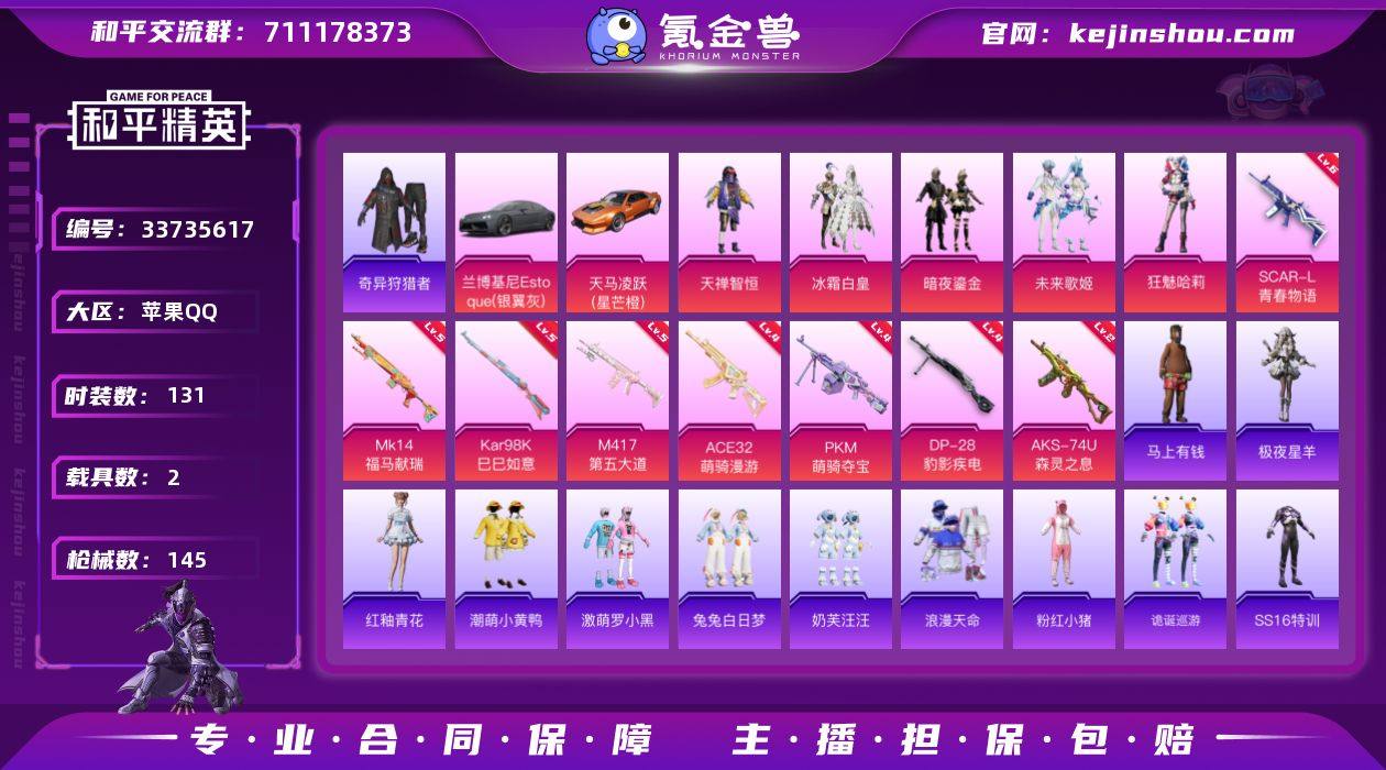 苹果 手Q-5粉装-8特效枪-2载具-1粉色飞行器-49710热力值-6王牌印记-131套装-145枪皮 【热门品类】:套装-浪漫天命,套装-奇异狩猎者,套装-潮萌小黄鸭,套装-粉红小猪 【粉色套装】:粉装-天禅智恒,粉装-冰霜白皇,粉装-暗夜鎏金,粉装-未来歌姬,角色-狂魅哈莉 【粉色枪皮等级】:SCAR-L-青春物语(六级),ACE32-萌骑漫游(四级),AKS-74U-森灵之息(二级),Kar98K-巳巳如意(五级),Mk14-福马献瑞(五级),M417-第五大道(五级),DP-28-豹影疾电(四级),PKM-萌骑夺宝(四级) 【粉色载具】:兰博基尼Estoque(银翼灰),天马凌跃(星芒橙) 【粉色枪皮】:SCAR-L-青春物语,ACE32-萌骑漫游,AKS-74U-森灵之息,Kar98K-巳巳如意,Mk14-福马献瑞,M417-第五大道,DP-28-豹影疾电,PKM-萌骑夺宝 【粉色飞行器】:太空嘟嘟飞行器 【粉色降落伞】:甜心宝贝降落伞,四圣焕新降落伞,暗夜玫瑰降落伞,洛神天依降落伞,蓝莓炮弹降落伞,橘柚倾心降落伞,太空嘟嘟降落伞,彩虹甜喵降落伞,暗夜鎏金降落伞,第五大道降落伞,炫光之旅降落伞,双重狂想降落伞 【稀有套装】:套装-马上有钱,套装-诡诞巡游,套装-雨过天青,套装-红釉青花,角色-极夜星羊 【稀有枪皮】:AKM-彩虹符号,AKM-灼热...
