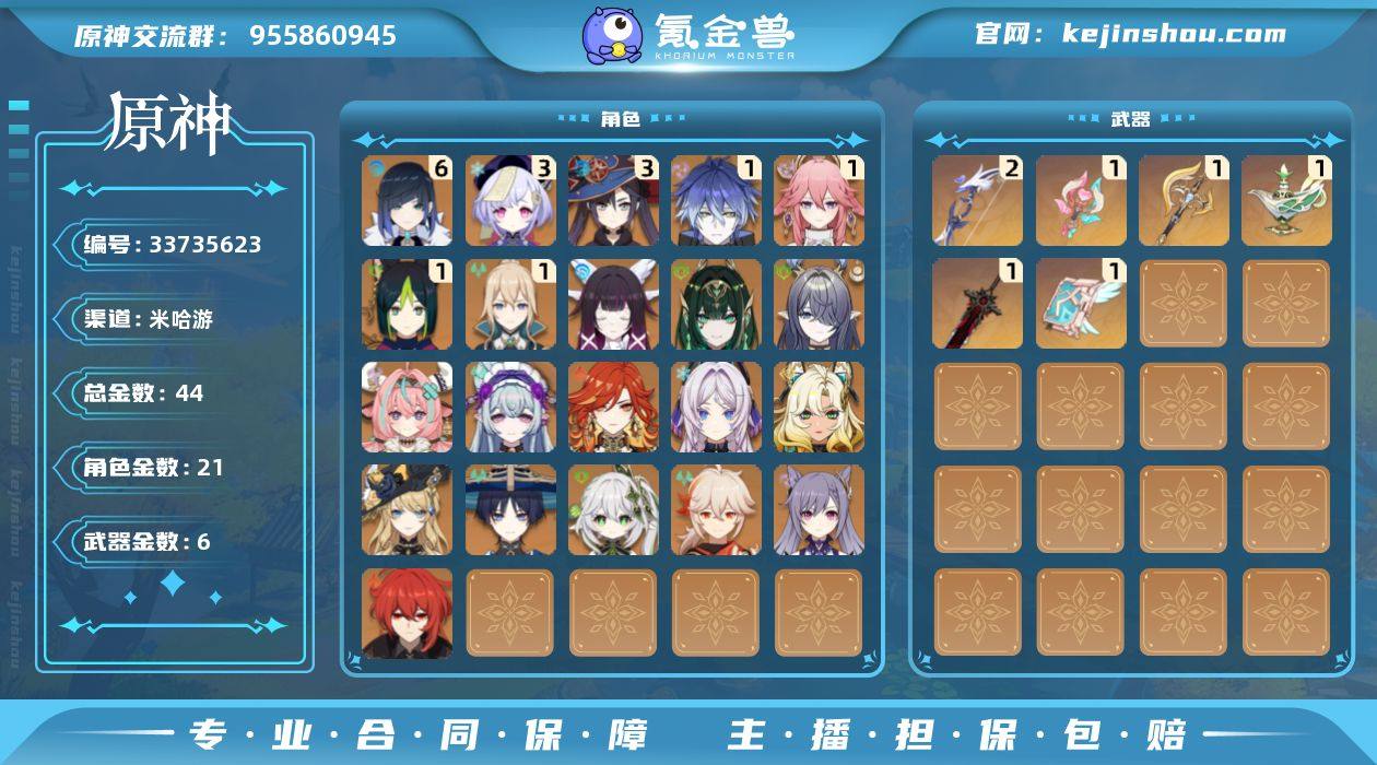 59级/44黄/男主/21个五星角色/6个五星武器 0命娜维娅,0命流浪者,0命纳西妲,1命提纳里,满命夜兰,1命八重神子,0命枫原万叶,0命刻晴,3命七七,1命琴,3命莫娜,0命迪卢克,0命希诺宁,0命玛薇卡,0命茜特菈莉,0命梦见月瑞希,0命瓦雷莎,0命菈乌玛,1命菲林斯,0命奈芙尔,0命哥伦比娅,精1裁断,精1千夜浮梦,精2若水,精1天空之卷,精1狼的末路,精1溢彩心念