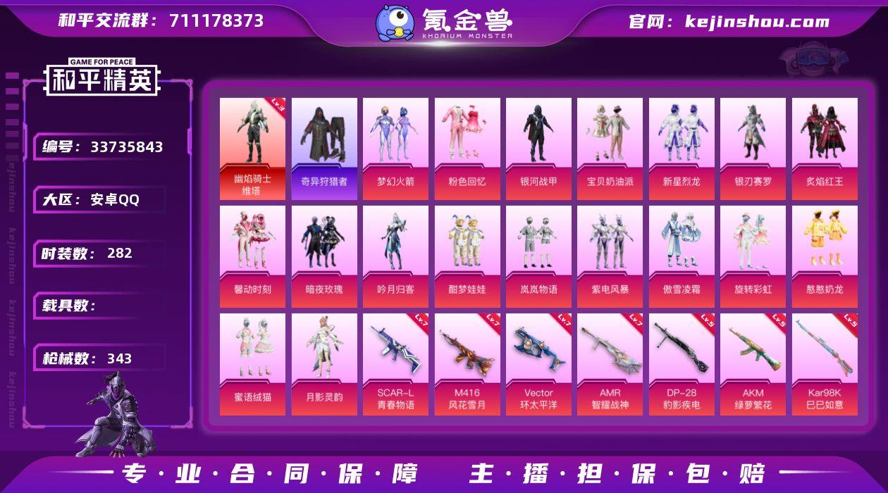 【kyhp1378】安卓 手Q-1神装-18粉装-9特效枪-0载具-4粉色飞行器-121053热力值-15王牌印记-282套装-343枪皮 【红色神装等级】:幽焰骑士-维塔(三级) 【红色角色神装】:幽焰骑士-维塔 【热门品类】:粉装-梦幻火箭,套装-浪漫天命,套装-小丑鱼,套装-奇异狩猎者,角色-军刀雅典娜,套装-龟仙人,套装-潮萌小黄鸭,套装-暗影哥特,套装-粉红小猪,熔岩游骑兵连帽夹克 【粉色套装】:粉装-粉色回忆,粉装-银河战甲,粉装-宝贝奶油派,粉装-梦幻火箭,粉装-新星烈龙,粉装-银刃赛罗,粉装-炙焰红王,粉装-馨动时刻,粉装-暗夜玫瑰,粉装-吟月归客,粉装-酣梦娃娃,粉装-岚岚物语,粉装-紫电风暴,粉装-傲雪凌霜,粉装-旋转彩虹,粉装-憨憨奶龙,粉装-蜜语绒猫,角色-月影灵韵 【粉色枪皮等级】:AKM-绿萝繁花(五级),SCAR-L-青春物语(七级),M416-风花雪月(七级),Vector-环太平洋(七级),Kar98K-巳巳如意(五级),Mk14-福马献瑞(三级),AMR-智耀战神(七级),DP-28-豹影疾电(五级),MG3-洛神天依(五级) 【粉色枪皮】:AKM-绿萝繁花,SCAR-L-青春物语,M416-风花雪月,Vector-环太平洋,Kar98K-巳巳如意,Mk14-福马献瑞,AMR-智耀战神,DP-28-豹影疾电,MG3-洛神天依 【粉色飞行器...